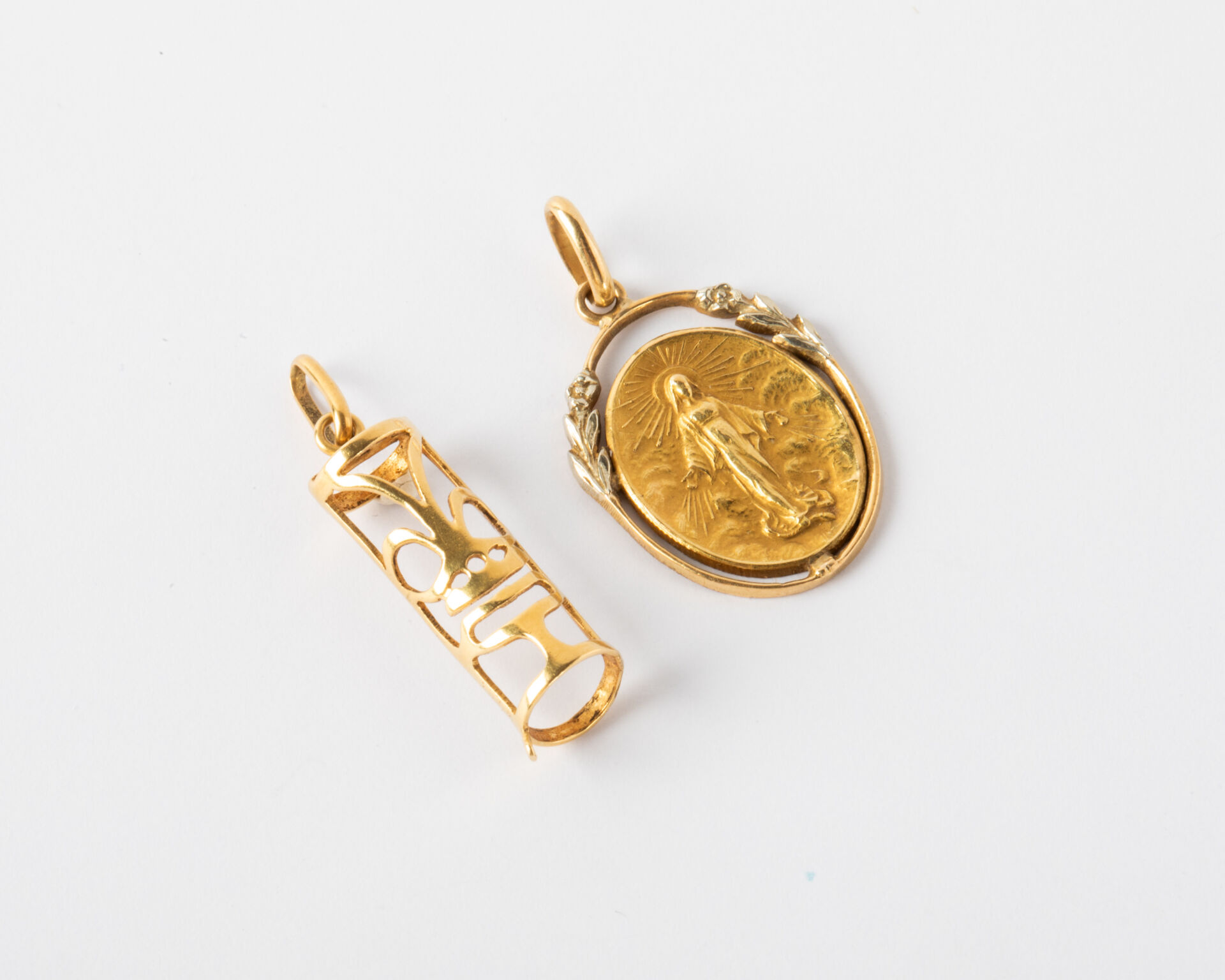 Ensemble en or jaune (750 millièmes) comprenant : - Médaille vierge or - Pendentif tubulaire ajouré Poids : 3 g.