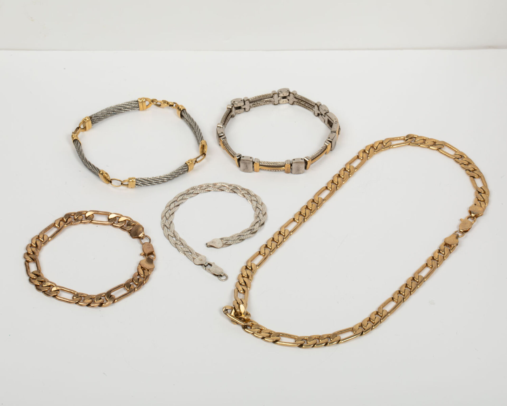 Ensemble de bijoux fantaisie comprenant : - Une gourmette or jaune (750 millièmes) et acier à quatre mailles Poids brut : 21.79 g. On y joint : - Un bracelet torsadé en argent - Un collier et un bracelet maille gourmette - Un bracelet à mailles