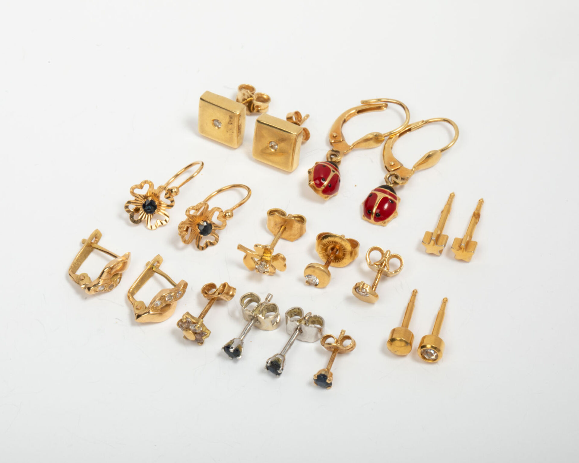 Ensemble en or jaune (750 millièmes) comprenant de six paires de puces d'oreilles On y joint une trois puces dépareillées Poids Brut : 7.8 g. On y joint quatre puces en métal