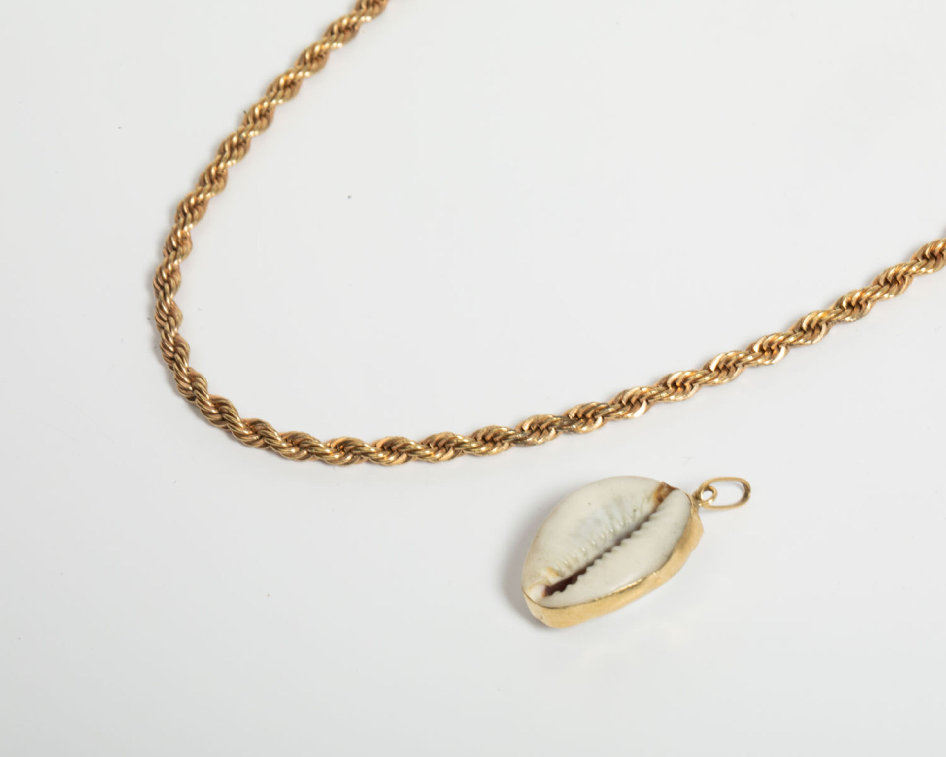 Collier maille tournée en métal doré, manque fermoir On y joint un pendentif coquillage serti d' or jaune (750 millièmes) accidenté Poids du sertissage : 0.2 g.