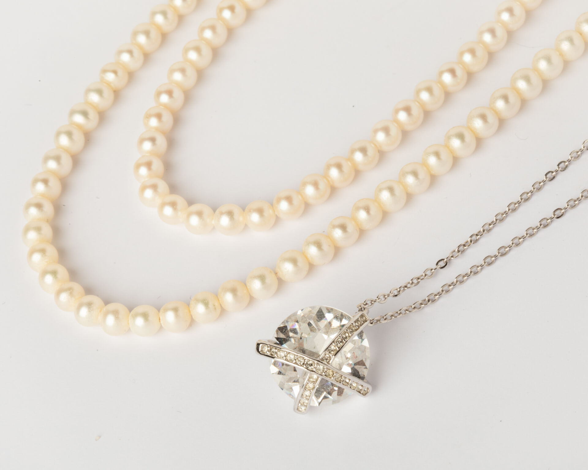 Parure comprenant un collier et un bracelet de perles On y joint un collier Swarovski monté à décor d'une pierre blanche sertie d'une croix pavée de strass