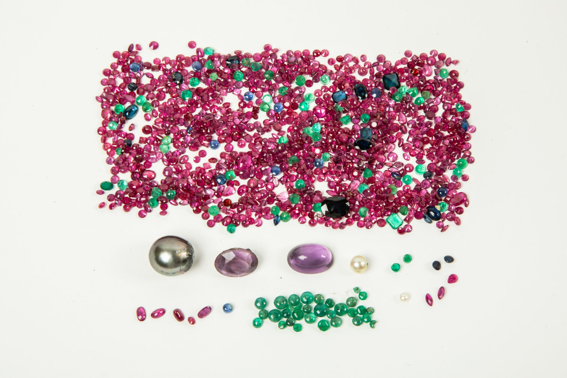 Lot de pierres précieuses sur papier pour environ 150 carats ( issus d'anciens bijoux, certains rubis traités et synthétiques). On joint deux améthystes (dont une usées).