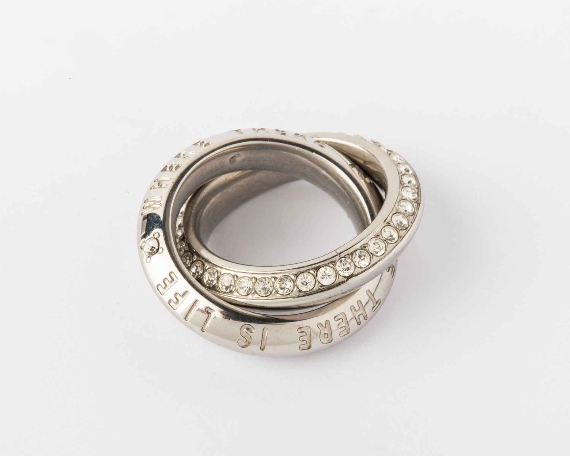 Bague fantaisie entrelacée pavée de diamants et gravée de la phrase "Where there is love there is life" Tdd : 40