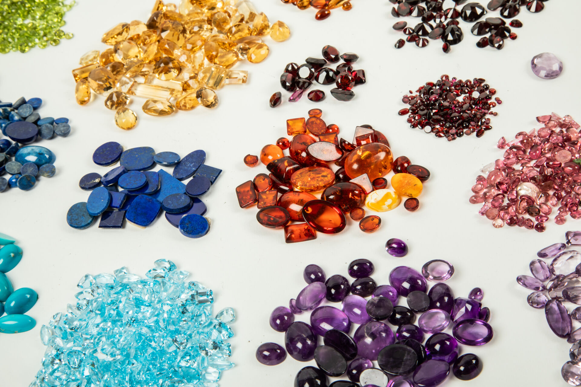 Important ensemble de pierres fines sur papier comprenant : turquoises, ambre, grenats, aigue-marine, lapis-lazuli, péridots, topazes, verres, tourmalines, améthystes, onyx, citrines.