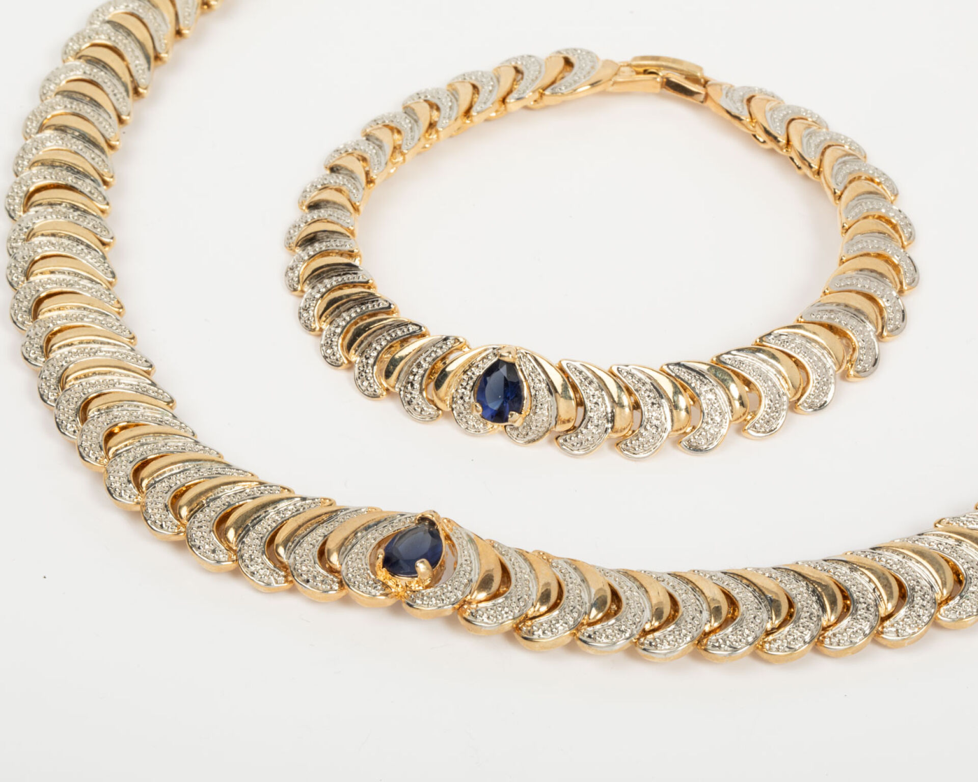 Parure en métal doré et strass à décor central d'une pierre bleue comprenant un collier et un bracelet