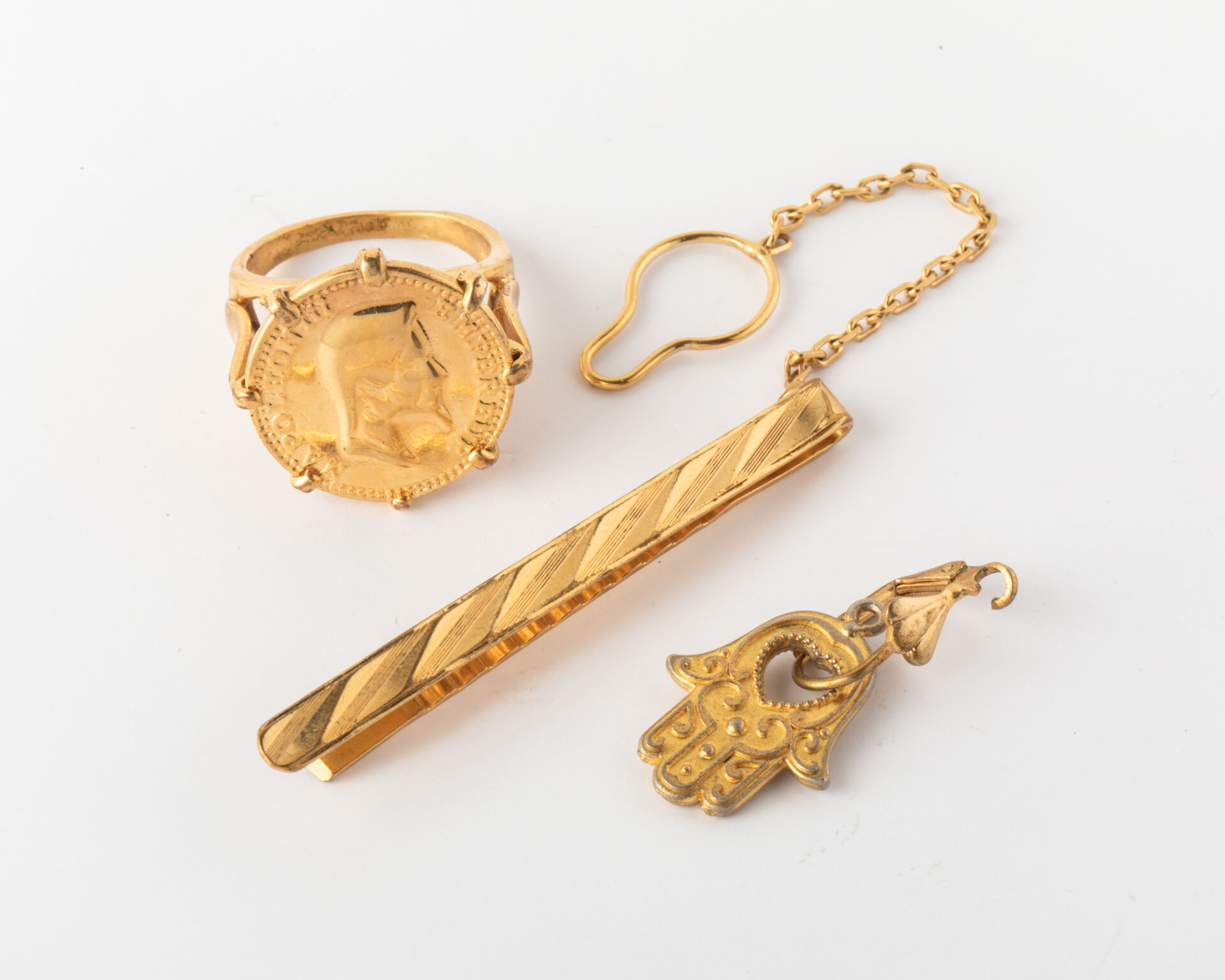 Ensemble de bijoux fantaisie comprenant une bague sertie griffe d'une imitation de pièce d'or, une pince à cravate et une dormeuse figurant la main de Fatma