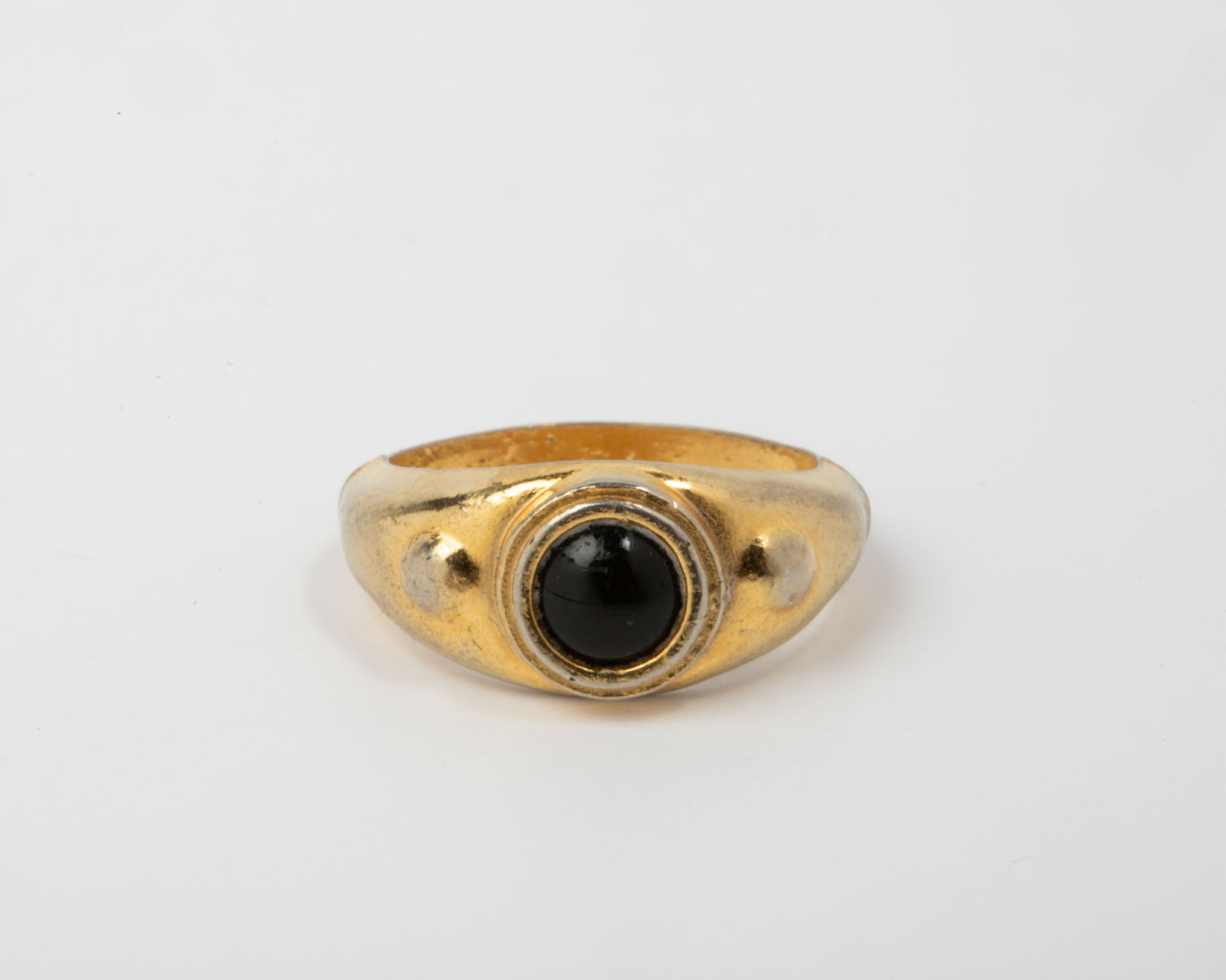 Bague en métal dorée sertie clos d'une pierre noire Manques à la dorure