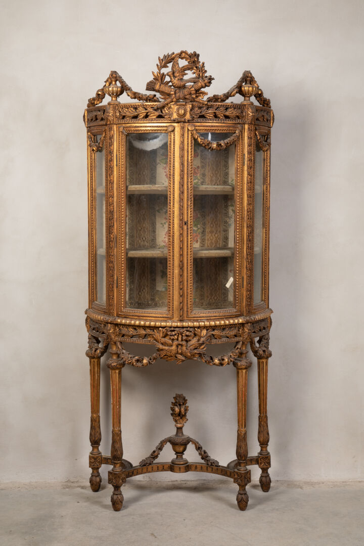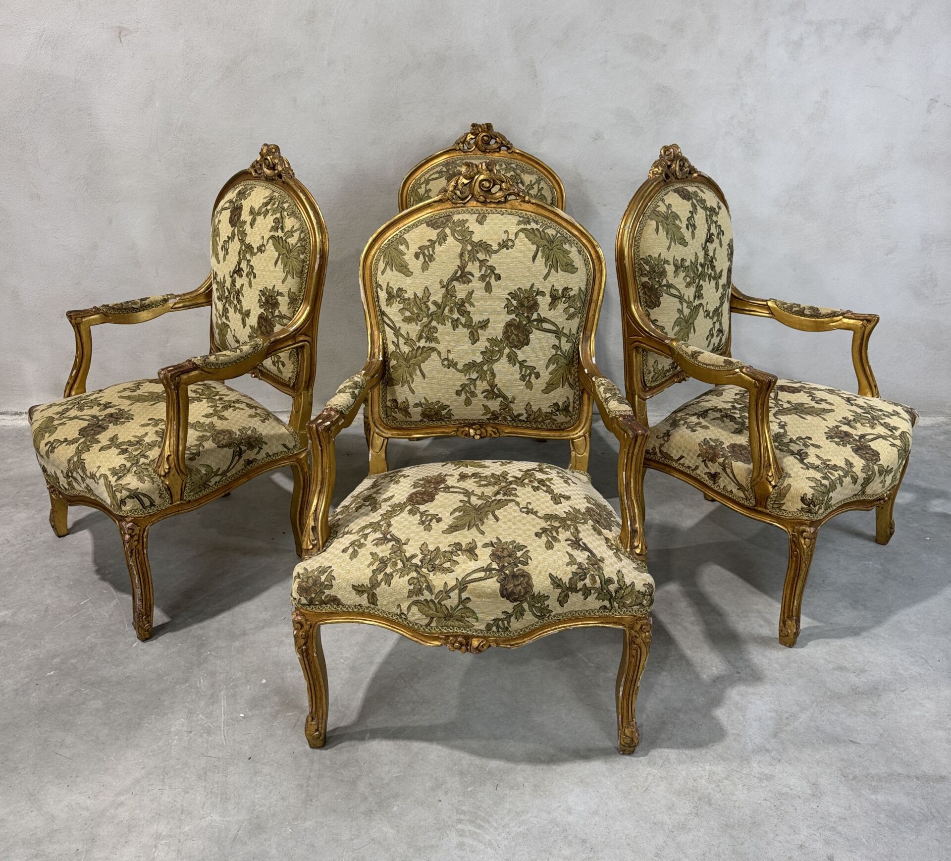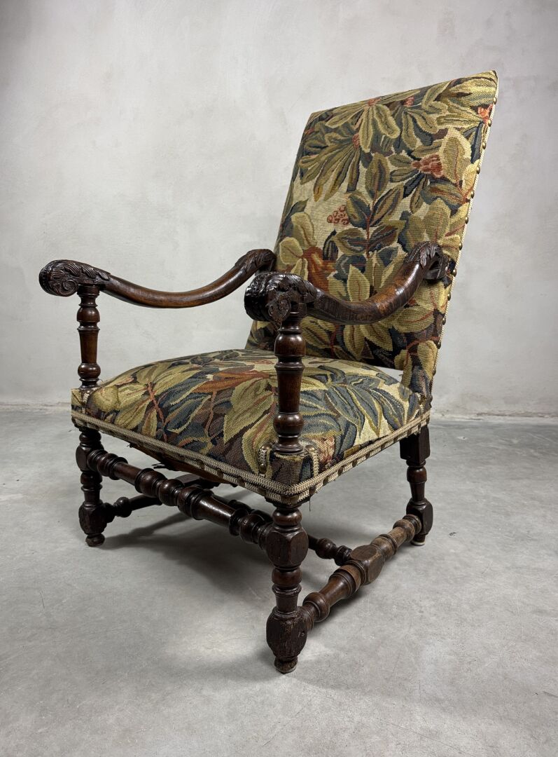 Important fauteuil d'apparat en bois naturel mouluré et sculpté à haut dossier droit, consoles d'accotoir sculptées à décor de feuilles d'acanthe enroulées, piètement en bois tourné relié par une entretoise en H Travail ancien de style Louis XIII Couverture de tissus brodé au canevas à décor de