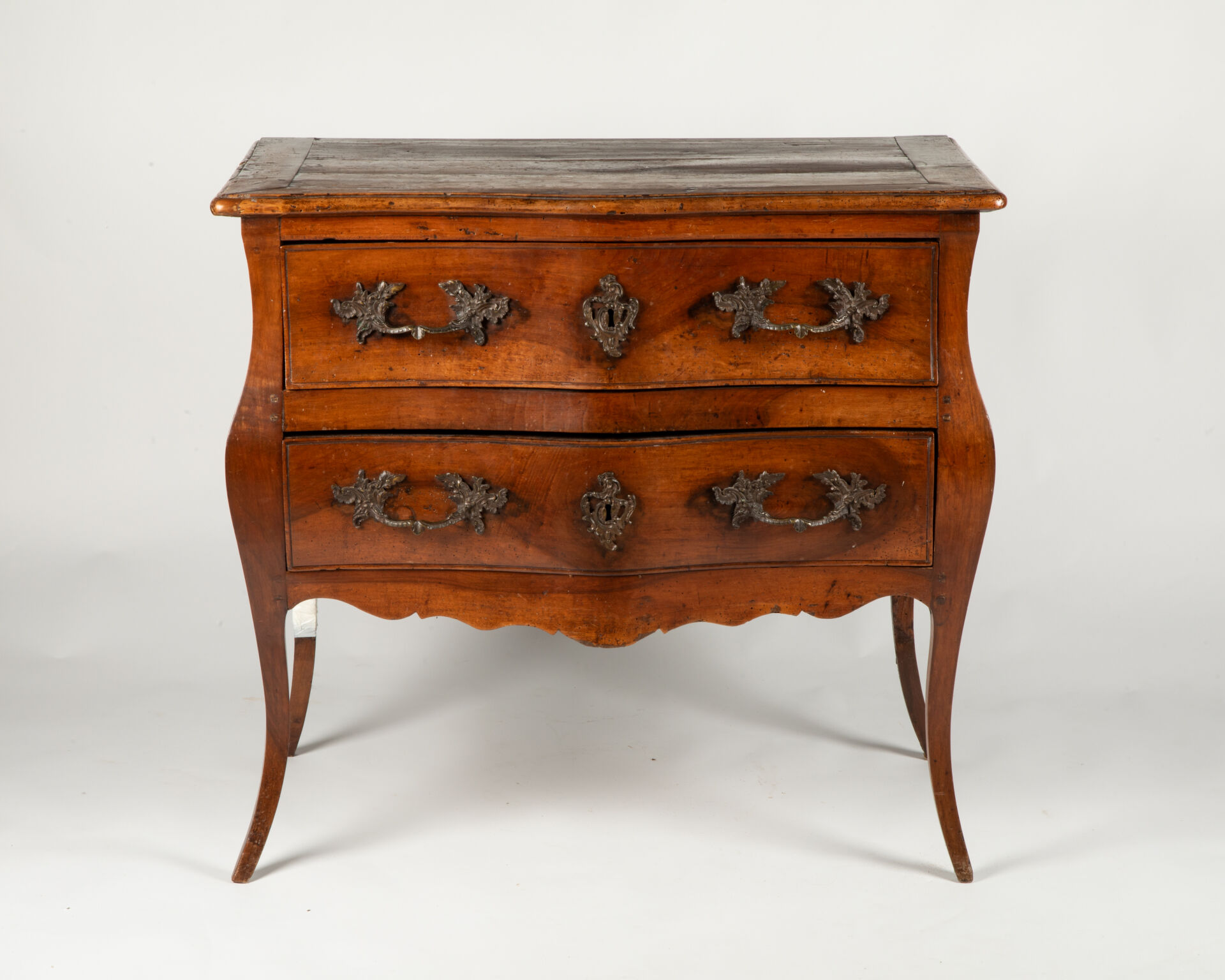 Petite commode sauteuse en bois naturel mouluré ouvrant à deux tiroirs et reposant sur quatre pieds cambrés, dessus de bois. Travail d'époque Louis XV Poignées fixes et entrées de serrure rapportées en bronze à décor de feuillages Restauration, les deux pieds arrières cassés à refixer, travail d'insectes H :