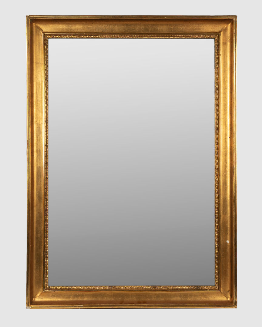 Miroir rectangulaire à encadrement de bois et stuc doré à décor de frise de raies de coeur Travail XIX° Sauts de matière et oxydations 96 x 69 cm
