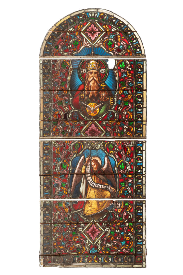 Grande verrière en verre peint polychrome en quatre parties représentant Dieu le Père bénissant et la Colombe du Saint-Esprit dans la partie supérieure. Au registre inférieur un ange portant un phylactère avec inscriptions IL CONTINUE D'AIMER LES SIENS JUSQU'A LA FIN. Fond rouge avec rinceaux