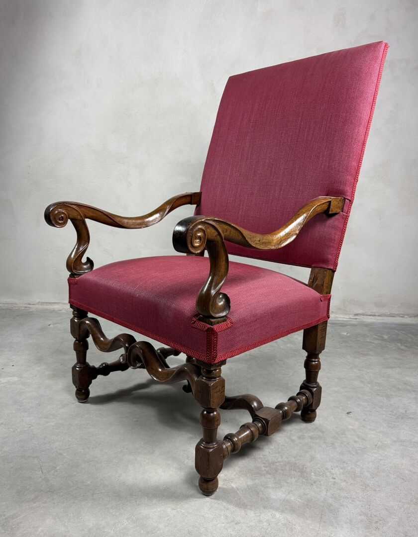 Fauteuil d'apparat en bois naturel mouluré à haut dossier droit, consoles d'accotoir en coup de fouet, reposant sur quatre pieds façon os de mouton stylisés et bois tourné reliés par une entretoise en H. Travail ancien de style Louis XIV. Couverture de tissus rouge H :