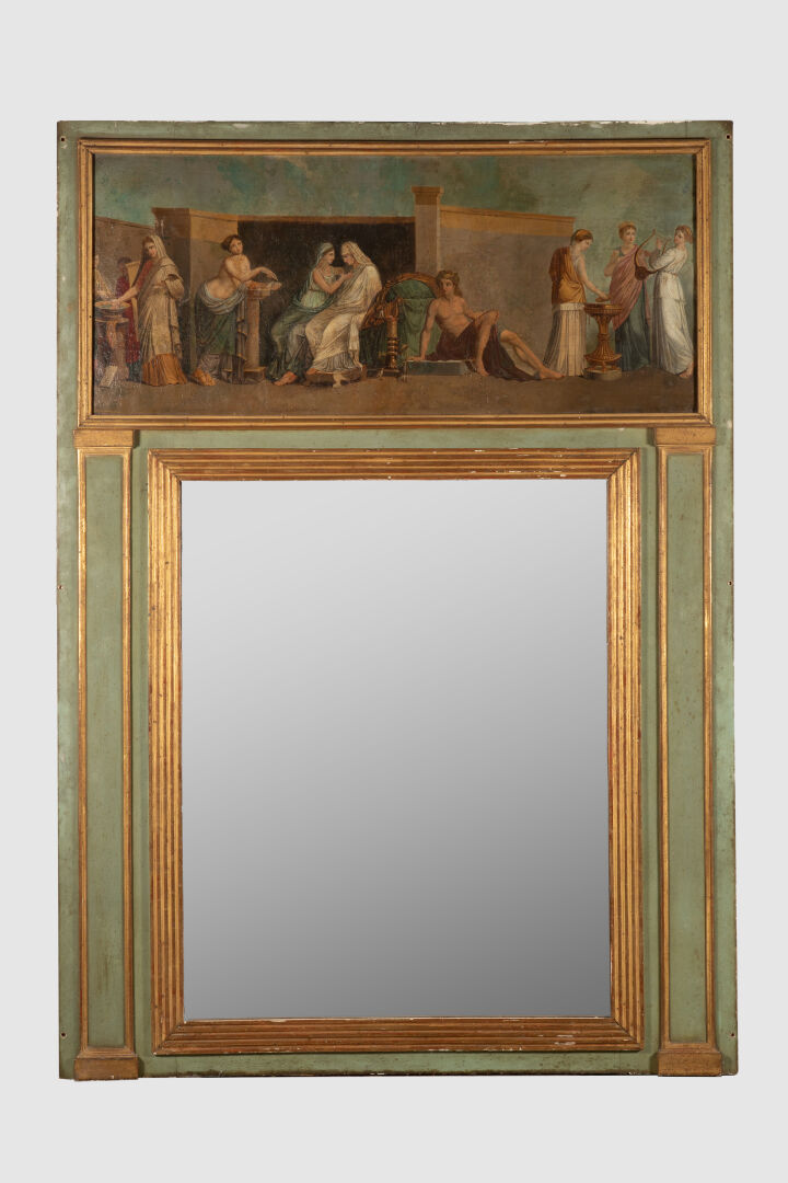 Important trumeau en bois mouluré peint vert d'eau et doré, le miroir en deux partie au mercure, sommé d'une toile à décor de scène à l'Antique Travail XVIII° Légers sauts de matière et repeints 203.5 x 147 cm