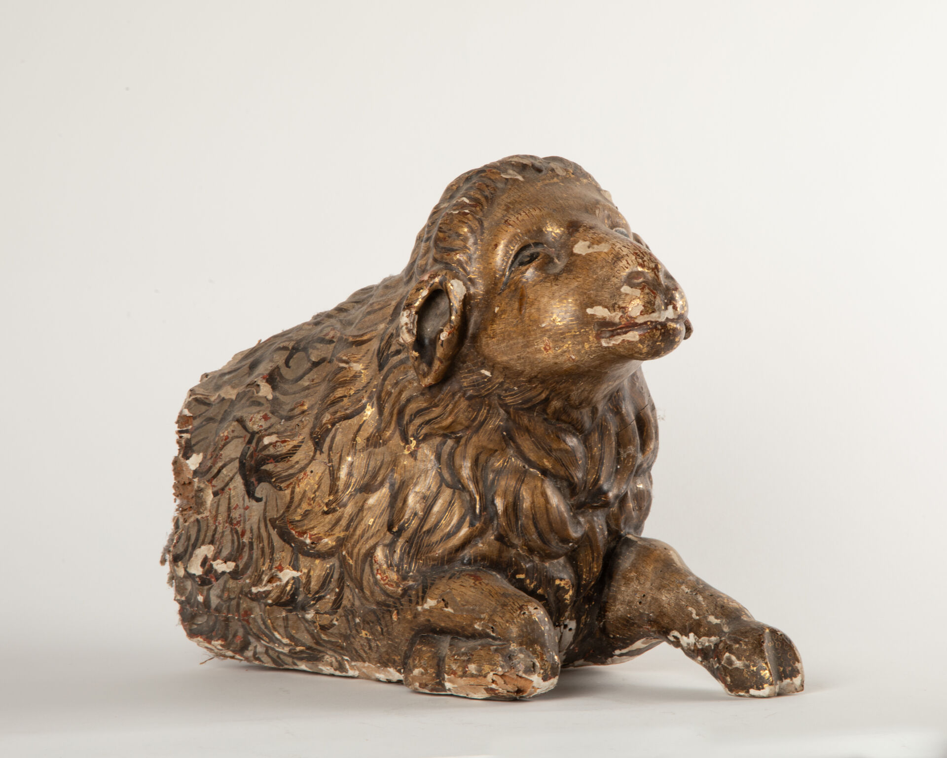 École Française XVIII° Agneau pascal Sujet en bois et stuc doré et peint, probablement issu d'une sculpture d'applique Accidents, sauts de matière et travail de vers H : 25 - L : 30 - P : 20 cm
