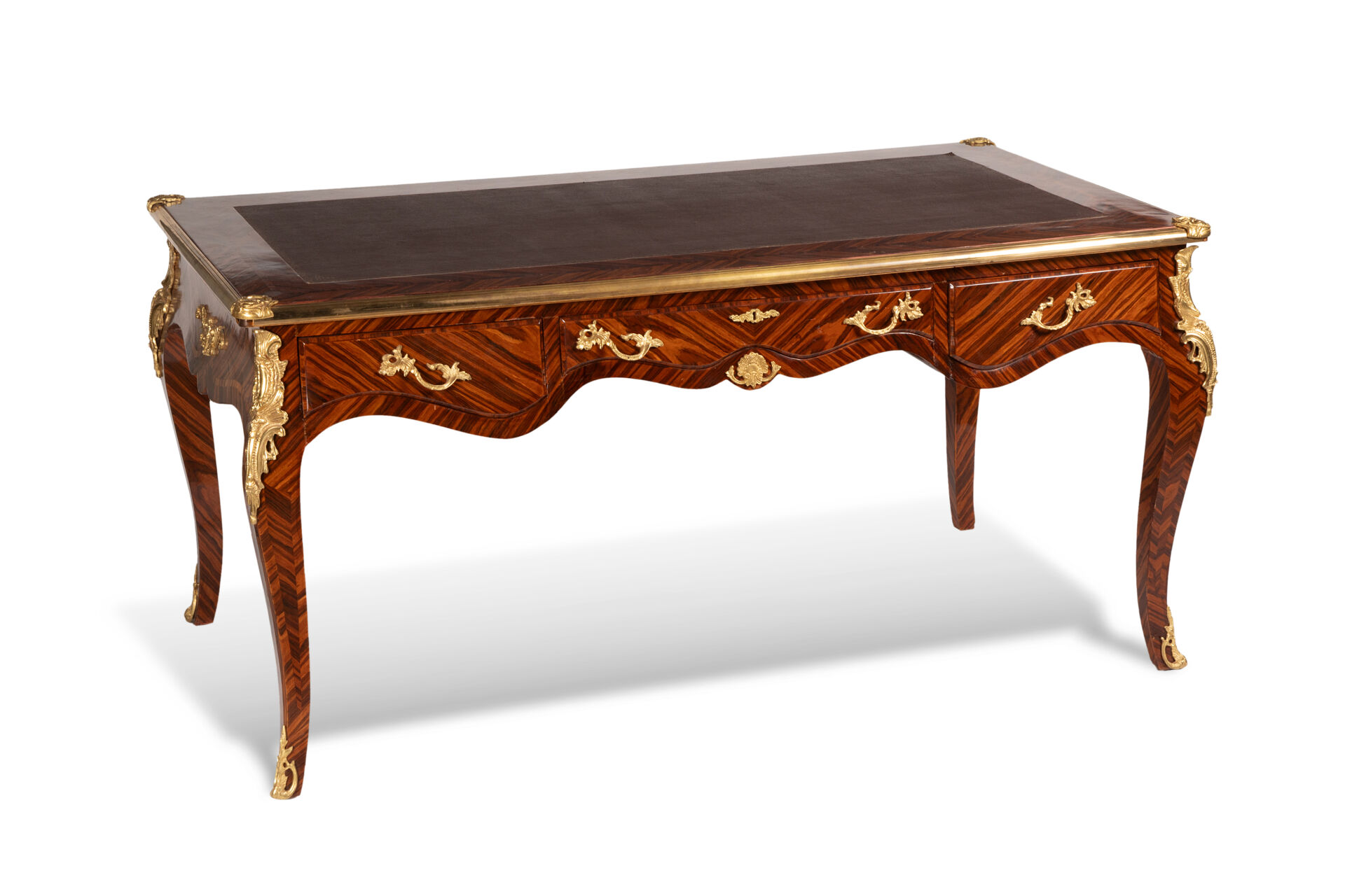 Important bureau d'apparat double face à décor marqueté de placage de bois précieux et appliques de bronze doré, le plateau recouvert en son centre de cuir à bordure dorée au petit fer, ouvrant en ceinture par trois tiroirs reposant sur quatre pieds galbés. Beau travail