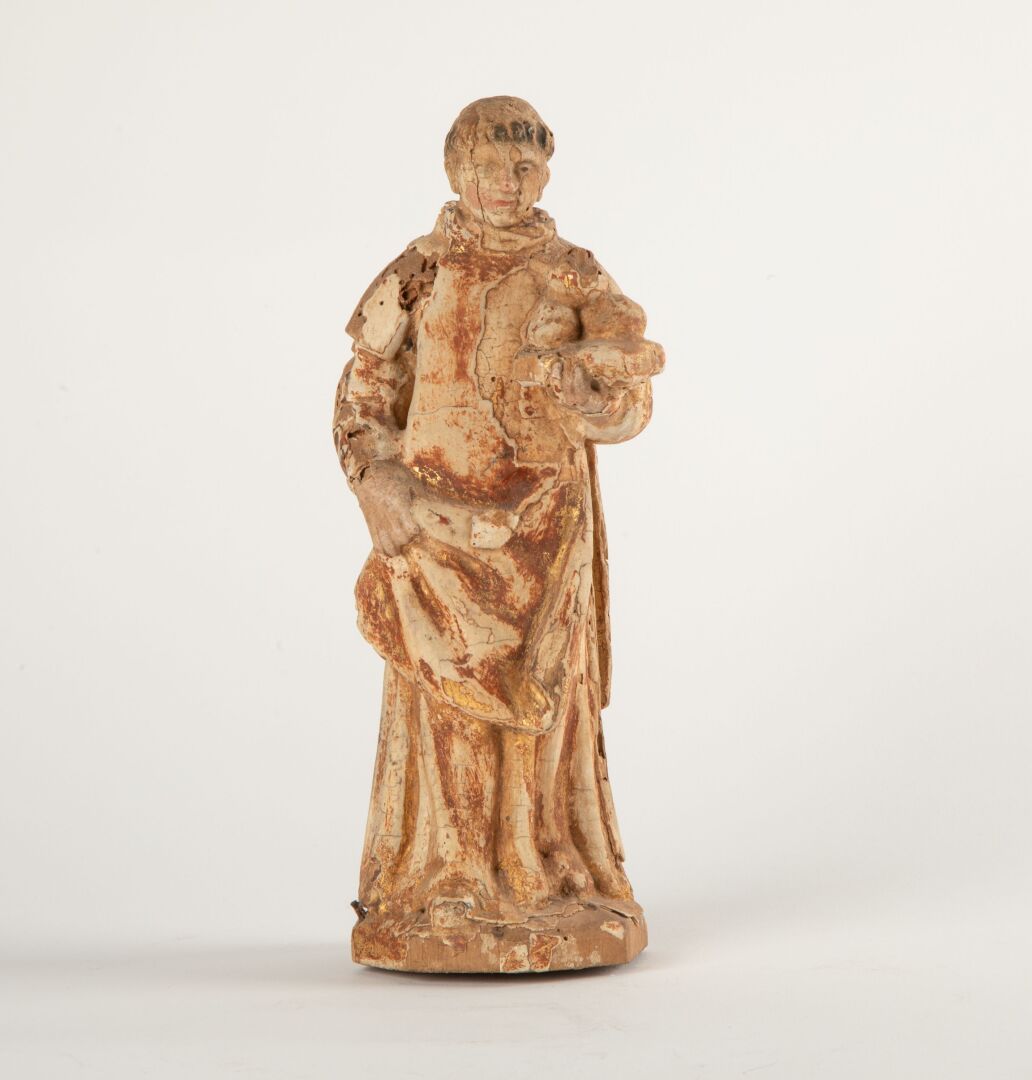 École Française XVIII° Saint Étienne Sujet en bois et stuc polychrome Restes de polychromie, accidents, manques, travail de vers H : 23 cm