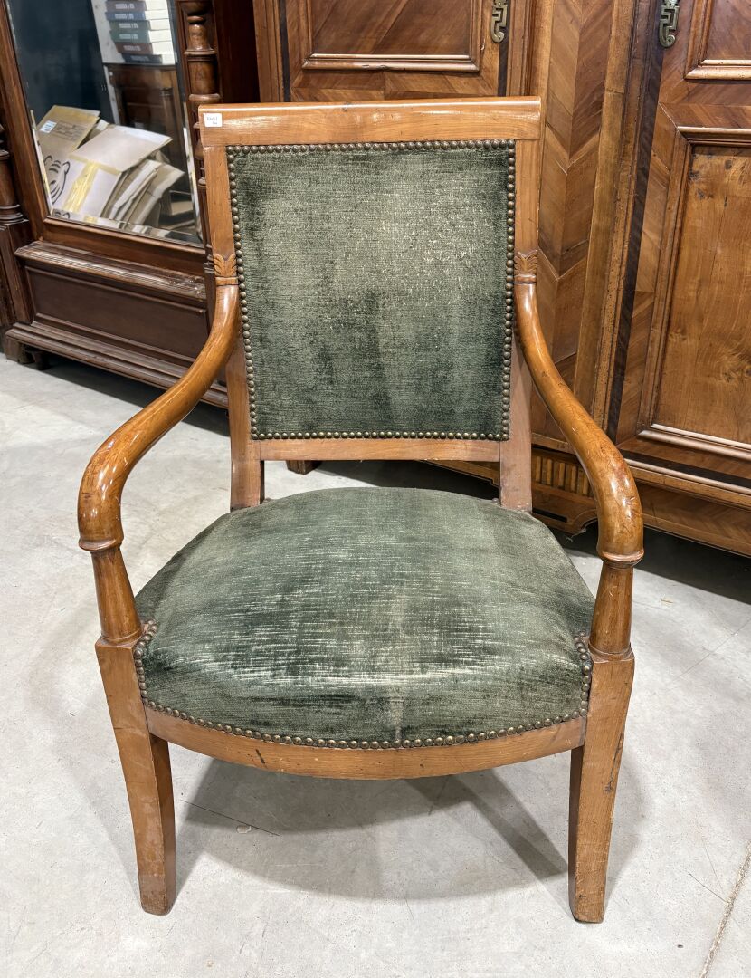 Fauteuil en bois naturel à dossier incurvé, accotoirs à larges bagues reposant sur quatre pieds sabre Couverture de velours vert Travail ancien de Style Directoire H : 88 cm