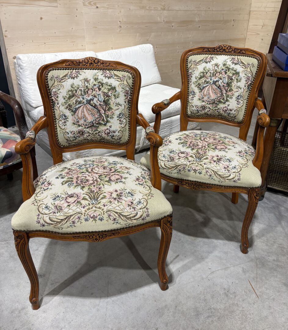Paire de fauteuils de style Louis XV Couverture à décor de scènes galantes Travail moderne H : 85 cm