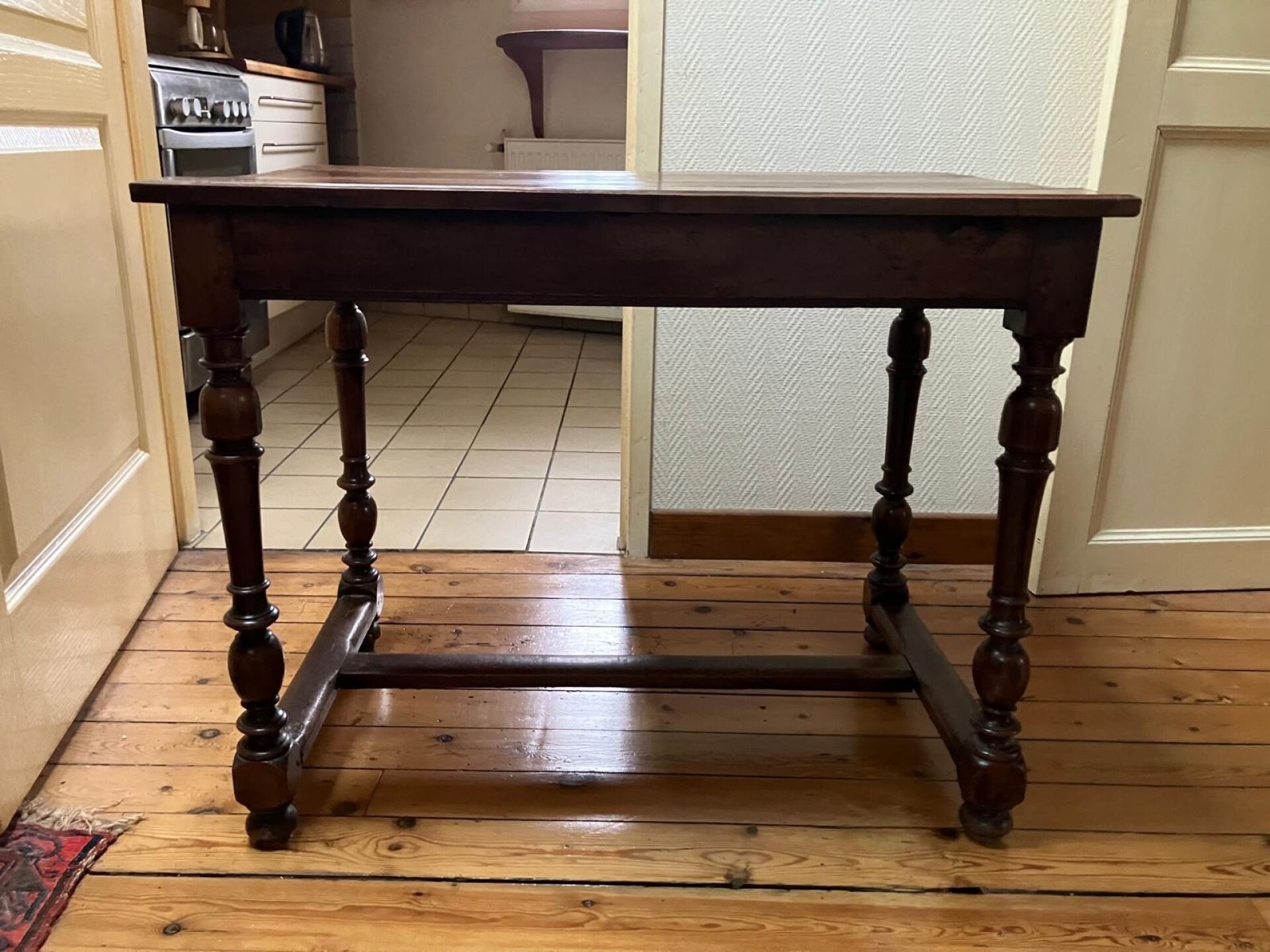 Petit bureau plat d'appoint en bois naturel, ouvrant par un tiroir latéral, reposant sur quatre pieds en bois tourné reliés par une entretoise en H Travail XIX° H : 69 - L : 86 - P : 54 cm
