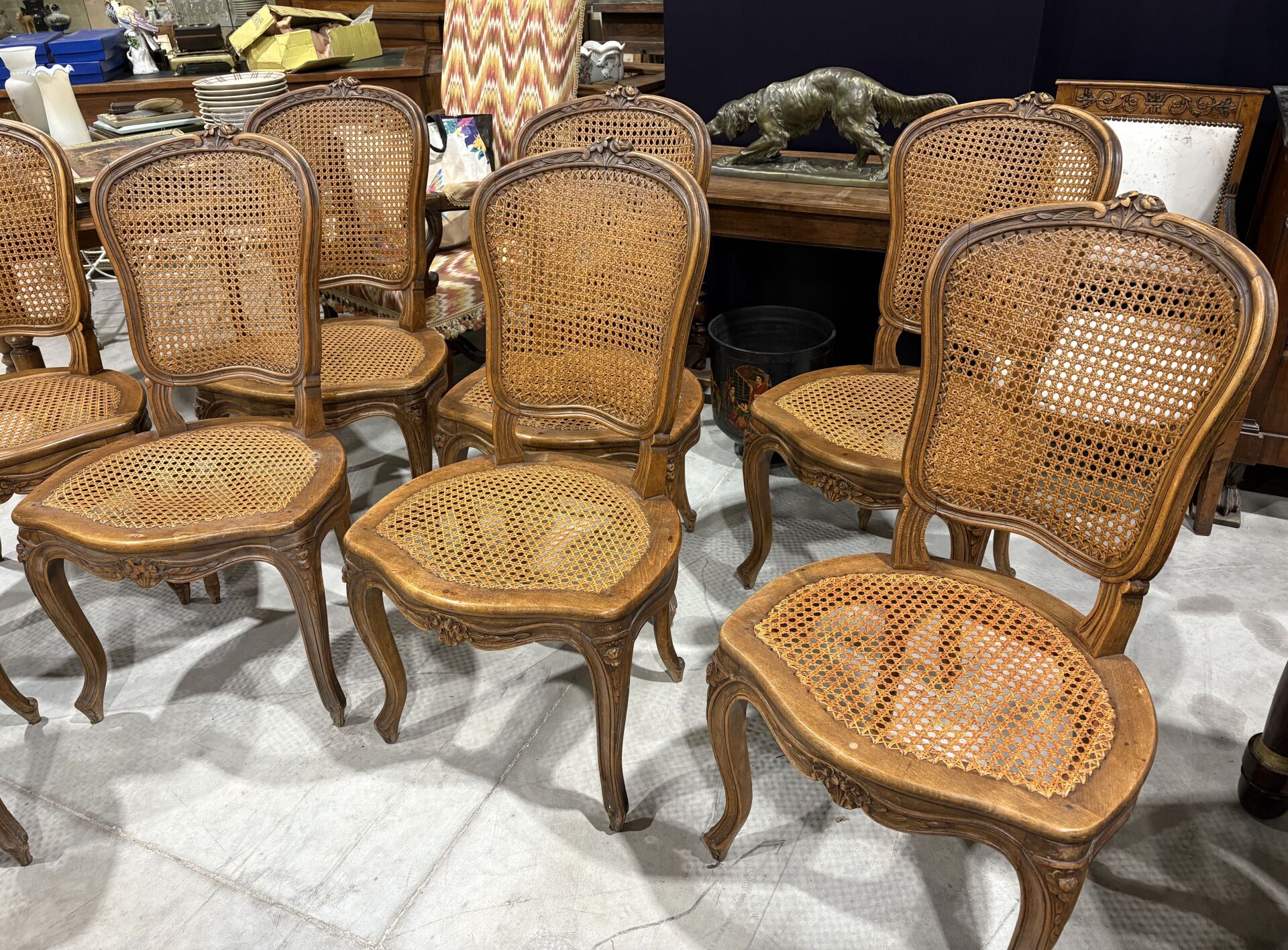 Suite de huit chaises en bois naturel sculpté et mouluré, dossiers et assises cannées, Travail de Style Louis XV Accidents et restauration On y joint des galettes à la forme