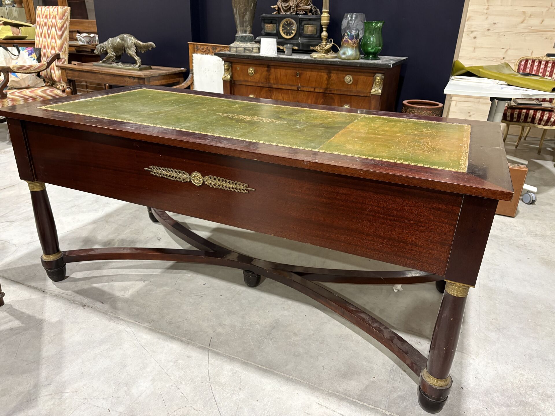 Bureau d'apparat en placage d'acajou, le plateau garni de cuir vert doré au petit fer, ouvrant par cinq tiroirs en ceinture et deux tablettes latérales également gainées de cuir reposant sur quatre pieds ornés de bronzes dorés reliés par une entretoise en x terminée par
