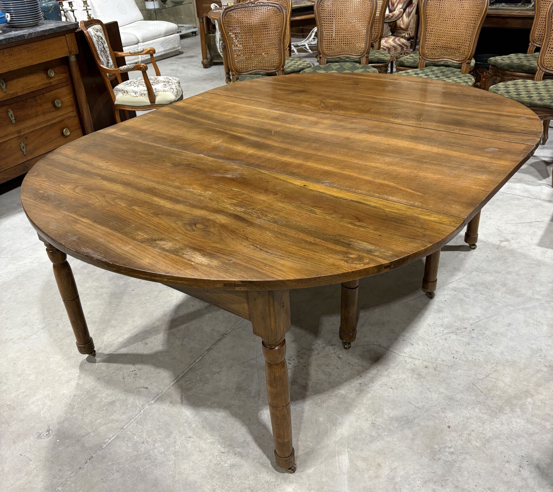 Importante table de salle à manger en bois naturel mouluré, système à allonges reposant sur huit pieds tournés terminés par des roulettes, à deux allonges, l'une identique au plateau, l'autre de nécessité. H : 71 - L : 149 - l : 189 cm avec
