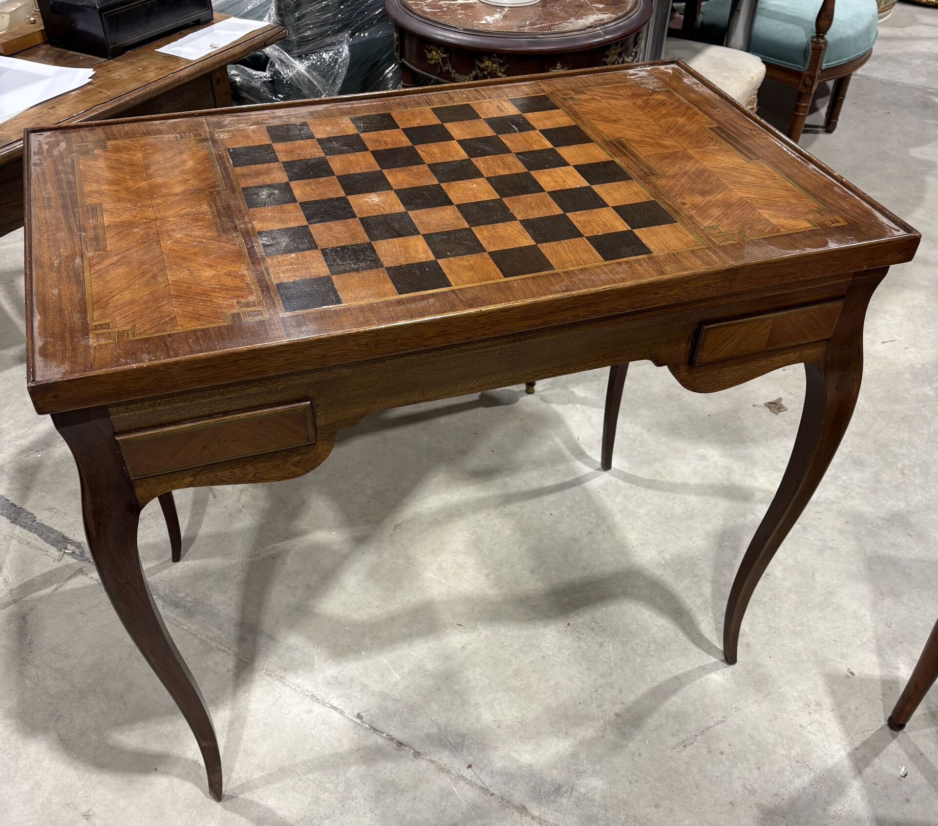 Table à jeux en placage et marqueterie de bois précieux, le plateau posé et réversible présente un échiquier ou un plateau de feutre vert (abimé) et découvre un plateau de backgammon reposant sur quatre pieds cambrés. Travail de Style Louis XV H : 77 -