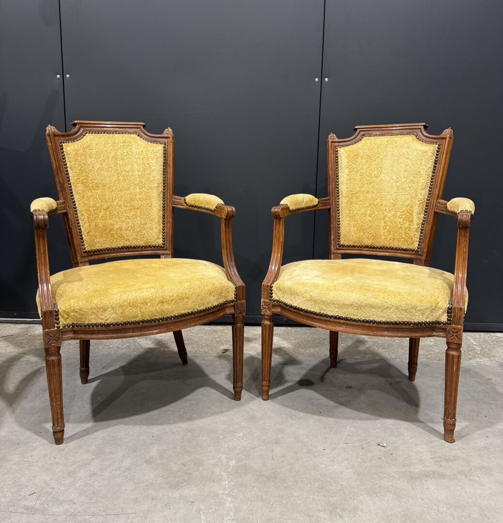Paire de fauteuils en bois naturel mouluré et sculpté Travail ancien de style Louis XVI Restauration a un pied