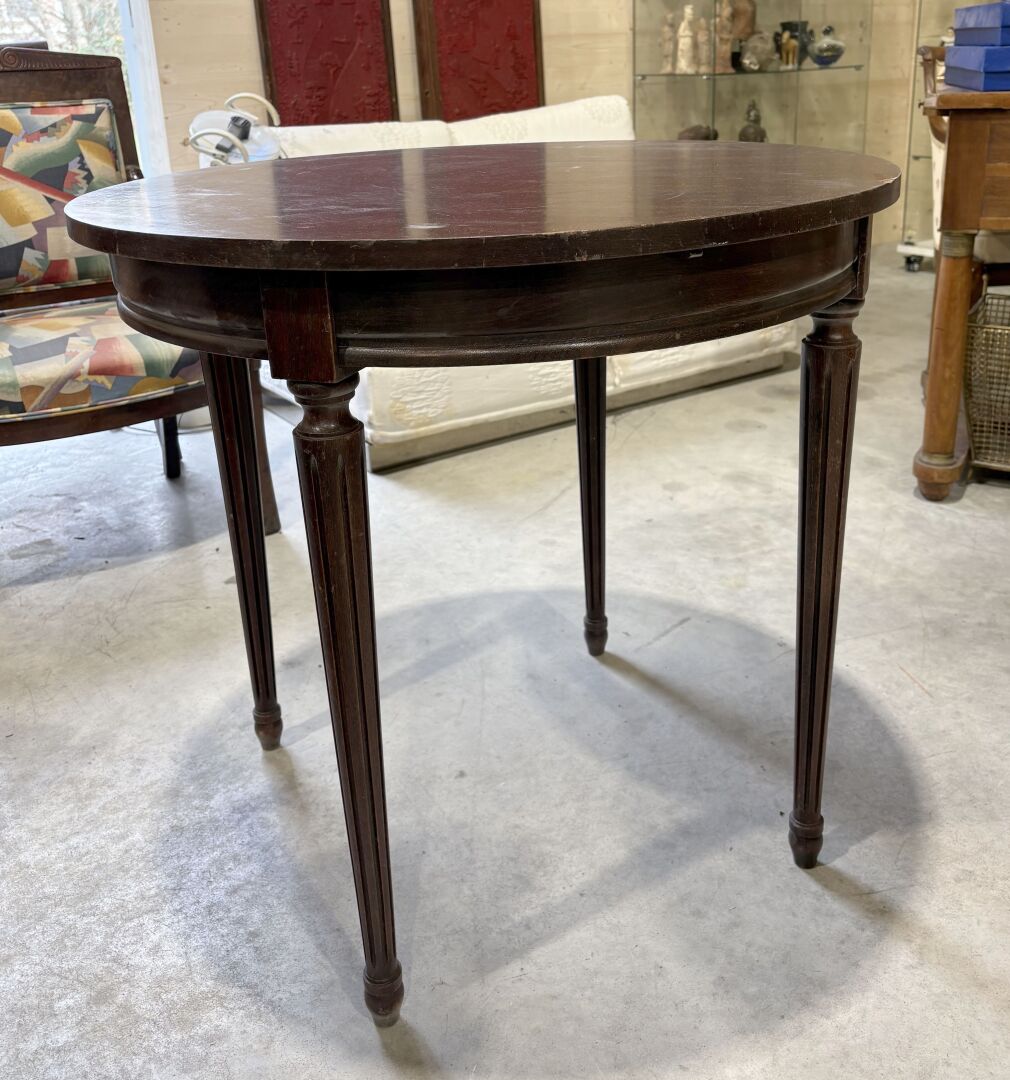 Table ronde d'appoint en bois naturel teinté reposant sur quatre pieds fuselés cannelés, les quatre pieds fixés sur glissières permettant d'ajouter une extension de plateau. Travail moderne de Style Louis XVI Chocs et rayures au plateau D : 80 - H : 75 cm