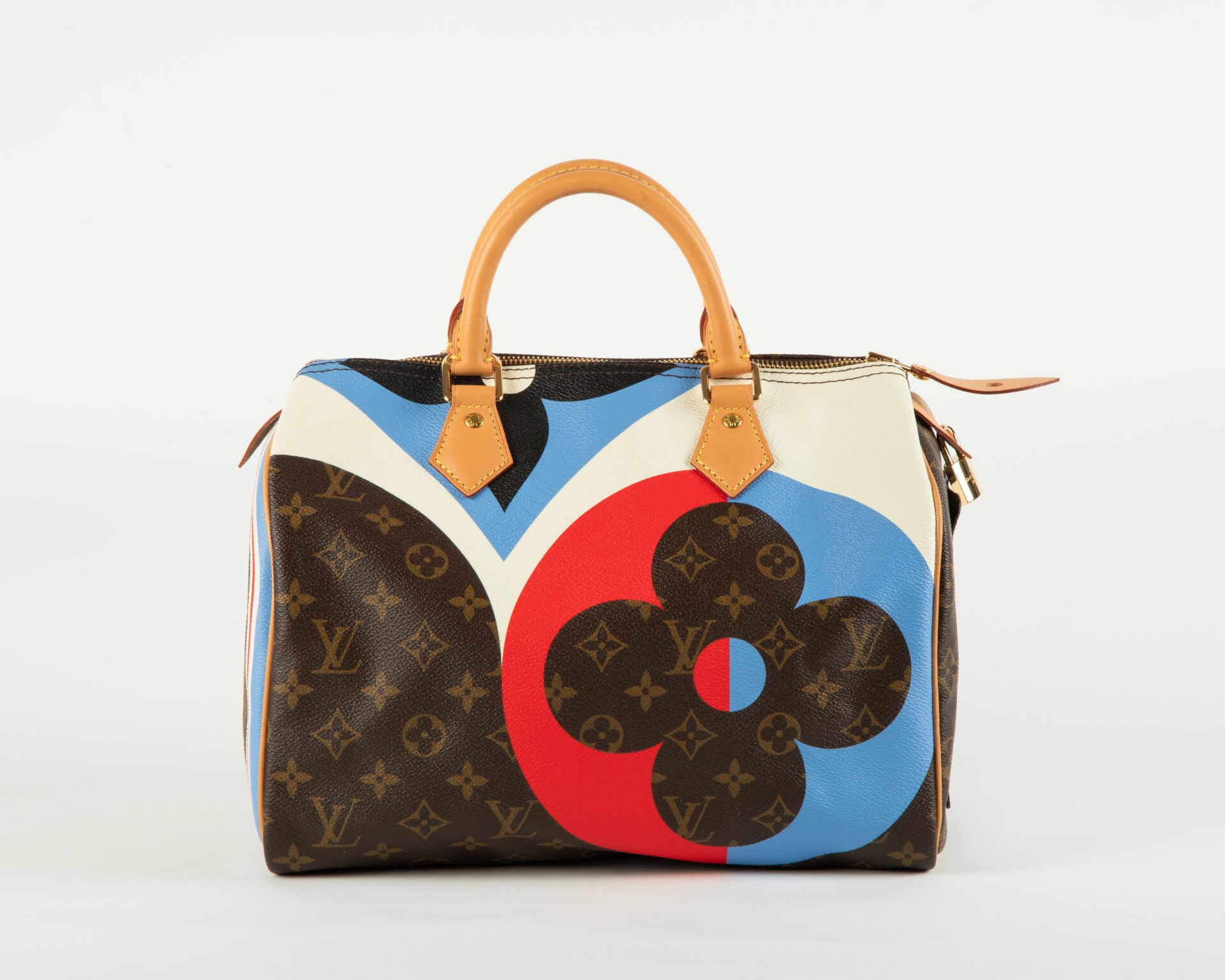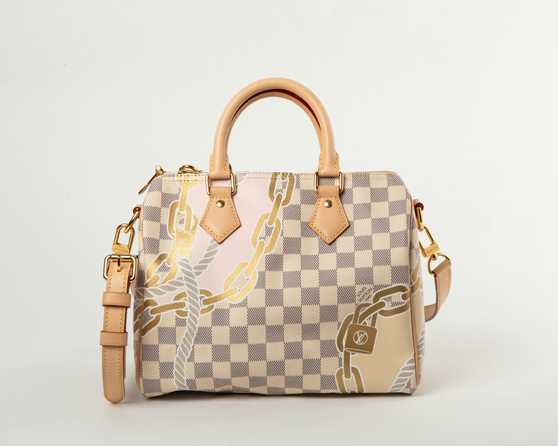 LOUIS VUITTON Modèle Speedy - Sac en toile monogram crème et cuir naturel à décor doré et rose de chaines et cordages, avec deux anses et une bandoulière, accastillage en métal doré, cadenas et deux clefs, intérieur en tissus monogrammé à une poche appliquée H