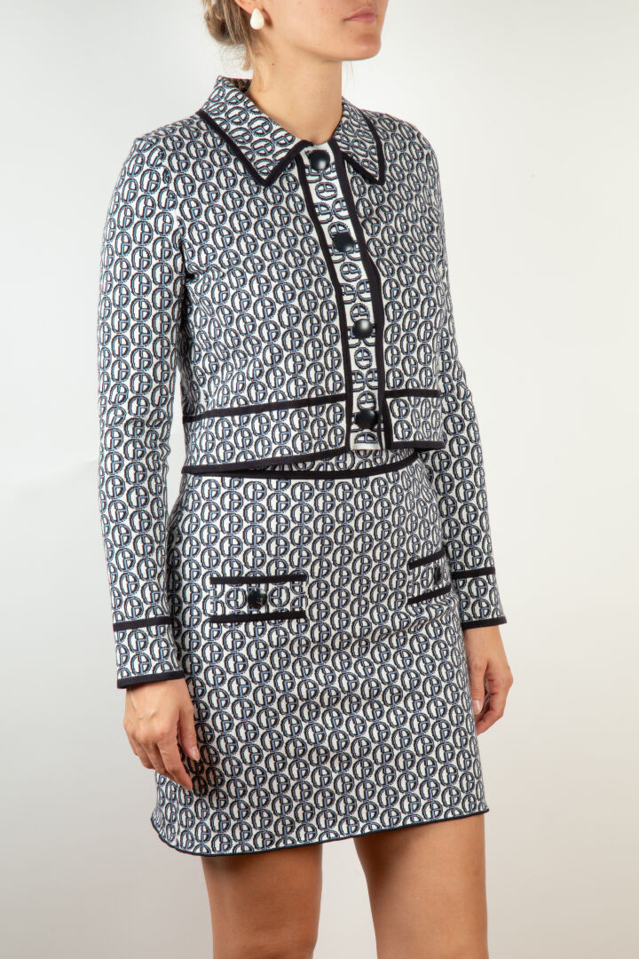 CLAUDIE PIERLOT Ensemble comprenant : - Trench modèle Gina beige à empiècements plissés au logo de la marque (Taille 36) - Ensemble en viscose au logo de la marque et liseré bleu nuit comprenant une jupe à deux poches plaquées (Taille 3) et un polo à