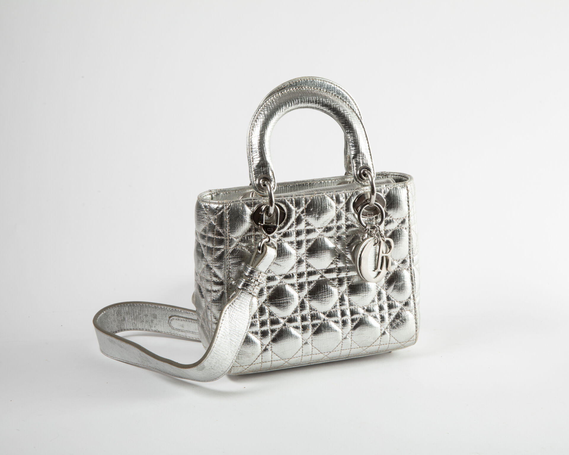 CHRISTIAN DIOR Sac Lady Dior en cuir matelassé argenté à deux anses et une bandoulière Traces de frottement et odeur de renfermé