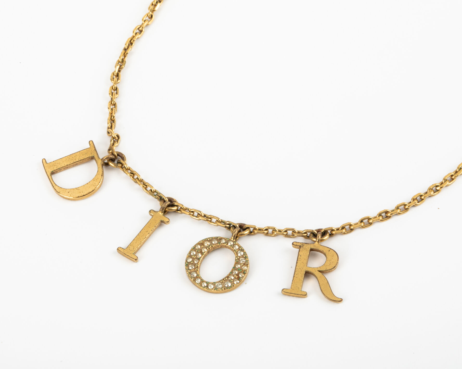 Christian DIOR, Paris Collier en métal doré à décor de lettres au nom de la marque, le O pavé de strass Etat d'usage