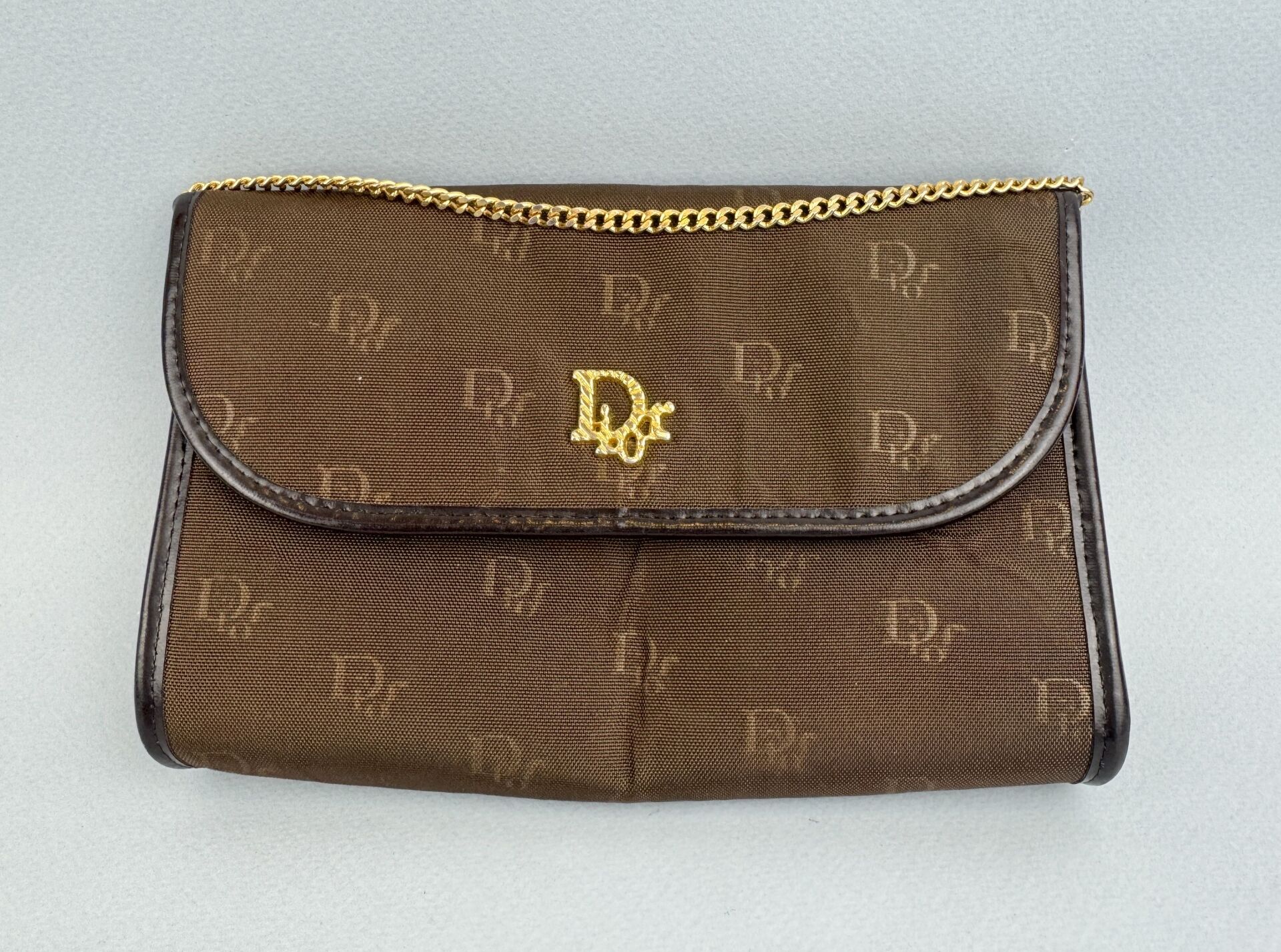 CHRISTIAN DIOR Sac à bandoulière en toile brune au logo de la marque et cuir marron, accastillage en métal doré, bandoulière en chaine dorée Défauts de collage de la toile H : 12.5 - L : 19 cm