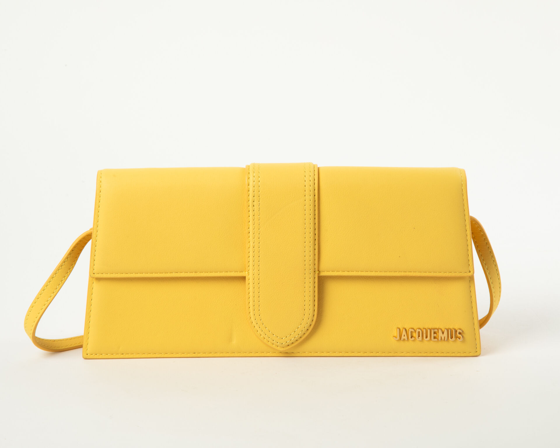 JACQUEMUS Modèle Bambino - Sac baguette en cuir lisse jaune porter épaule, fermeture aimantée, poche appliquée au dos, accastillage en métal doré, intérieur en tissus crème à une poche appliquée en cuir H : 14 (hors anses) - L : 28 - P : 6.5 cm