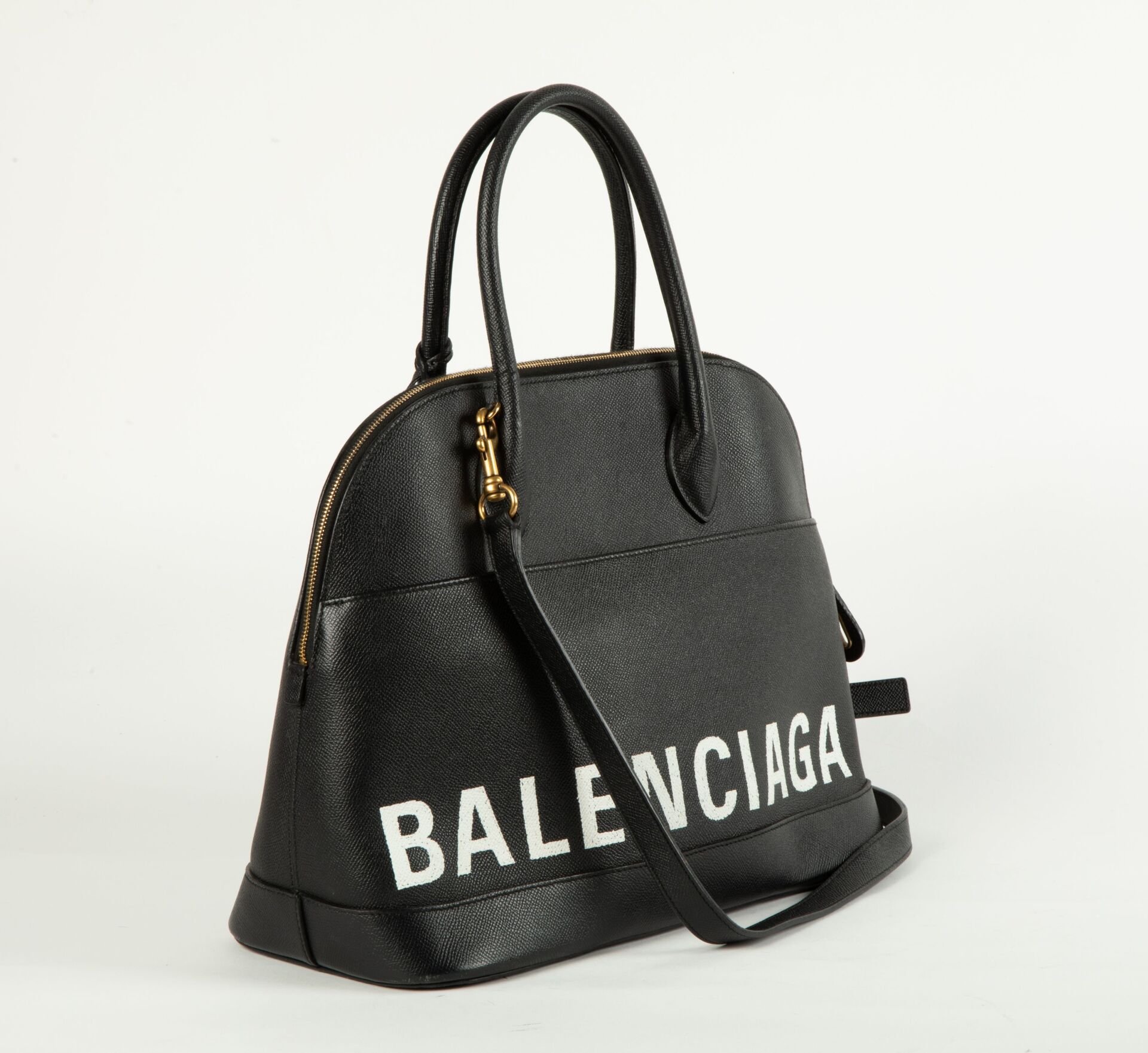 BALENCIAGA Modèle Ville - Sac à main en cuir de veau grainé noir porter main et bandoulière, accastillage en métal palladié, cadenas, clochette et clefs, intérieur en cuir et tissus rouge à une poche et une poche zippée en applique. H : 29 (Hors anse)