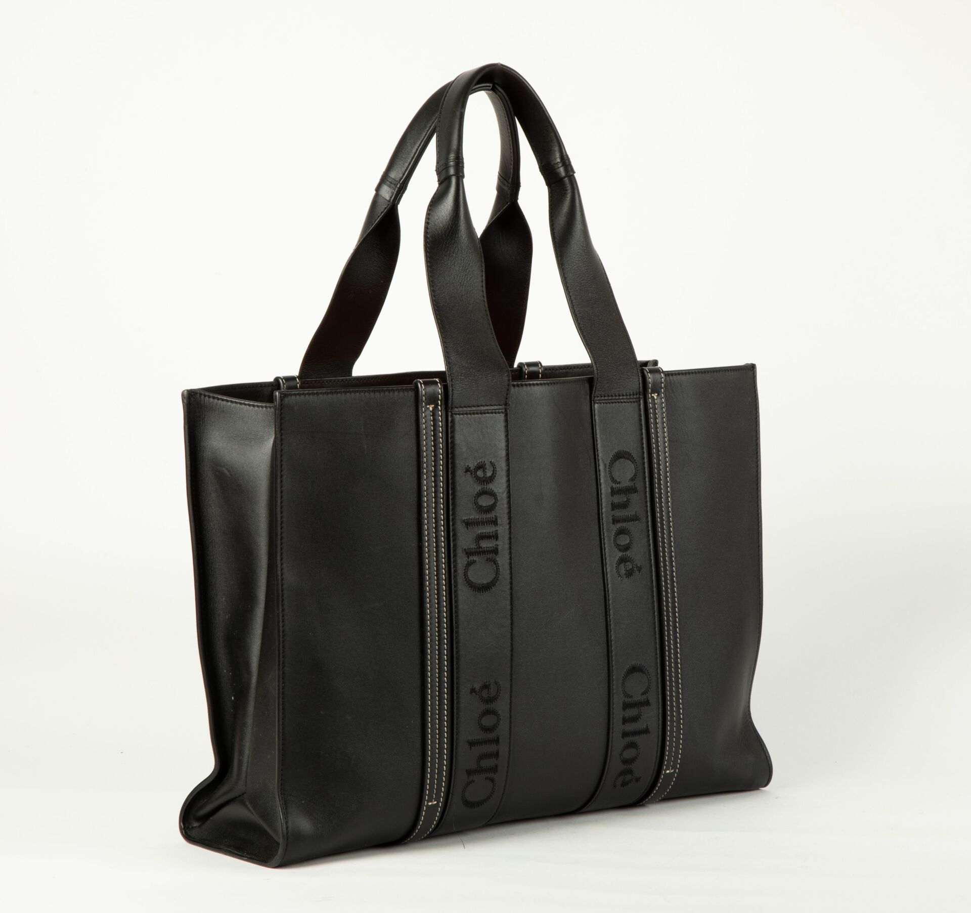 CHLOE Modèle Woody - Cabas en cuir noir lisse à surpiqures blanches à deux anses, doublure en toile beige, poche intérieure plaquée H : 32 (hors anses) - L : 44 - P : 13 cm