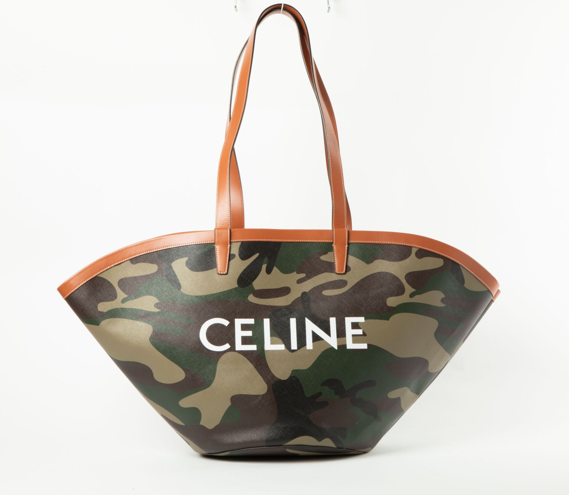 CELINE, Paris Modèle Couffin - Sac cabas en toile enduite camouflage et cuir camel H : 30 (hors anse) - L : 66 - P : 20 cm