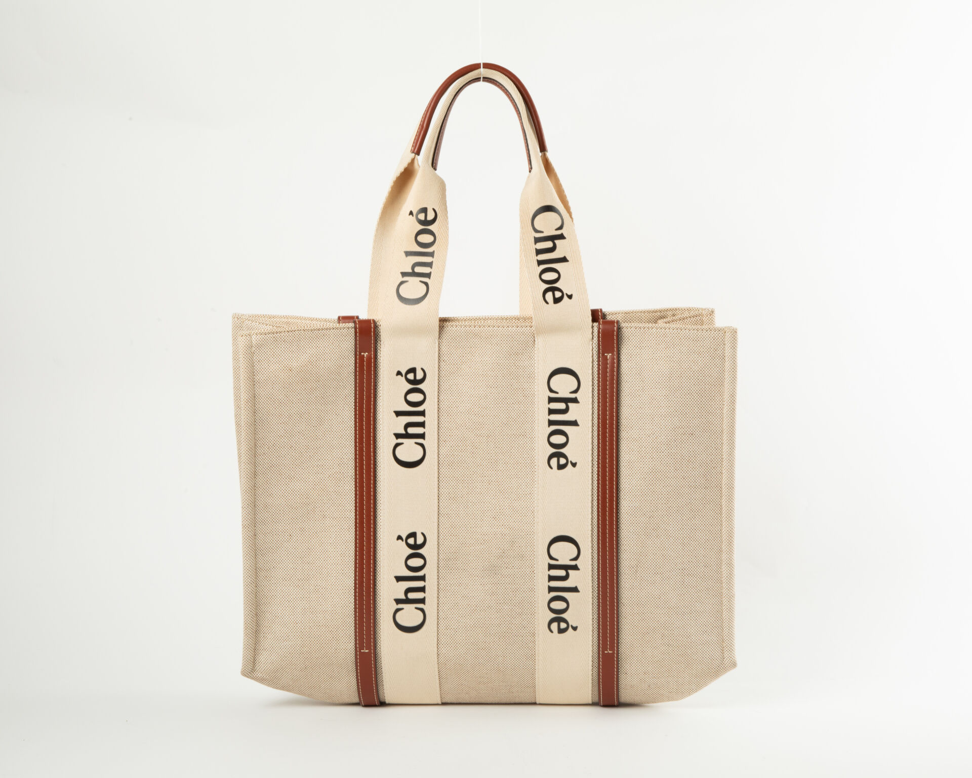 CHLOE Modèle Woody - Cabas en toile de lin à empiècements en cuir lisse camel à deux anses, doublure en tissus beige, poche intérieure appliquée. Légères tâches H : 37 (hors anses) - L : 43 - P : 12 cm