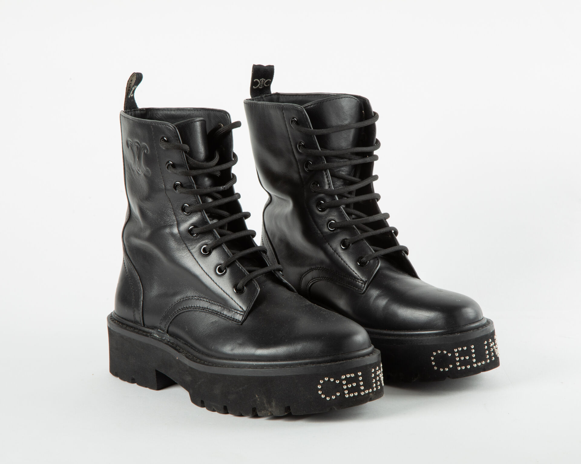 CELINE, Paris Modèle Bulky - Bottines type rangers en cuir lisse noir à bout rond, lacets et œillets noirs, logo triomphe en relief sur les côtés extérieurs des tiges, semelles intercalaires en caoutchouc noir avec inscription cloutée "CELINE" Petites rayures Pointure 39