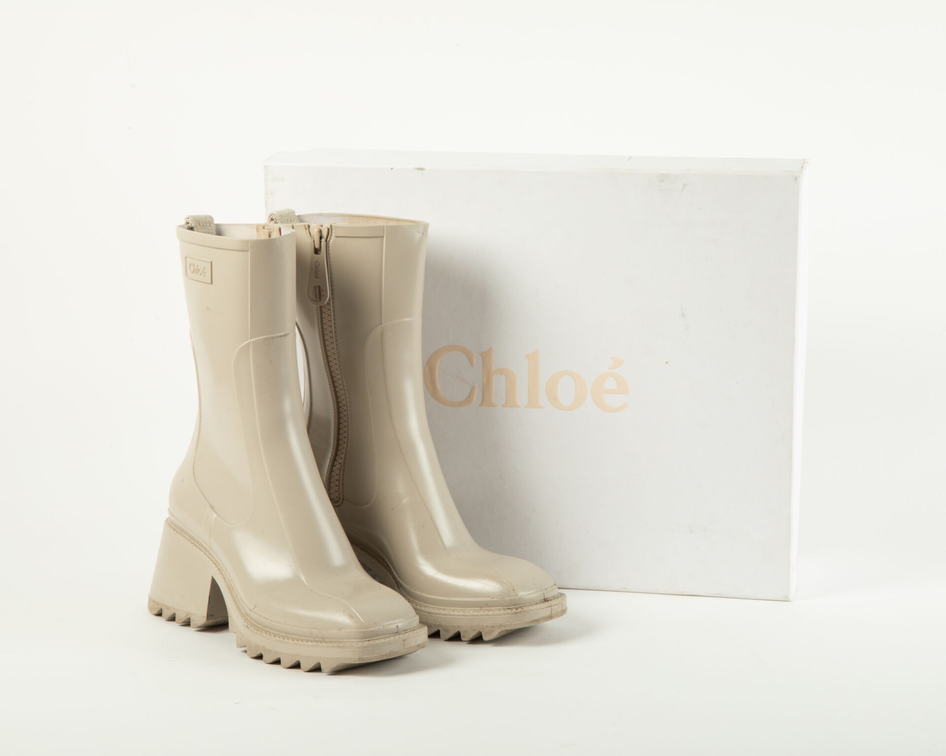 CHLOE Paire de bottines de pluie modèle Betty en caoutchouc nomad beige à fermeture zippée latérale Traces de frottement Taille 38 - Hauteur talon : 7.5 cm environ Avec dustbag et boite