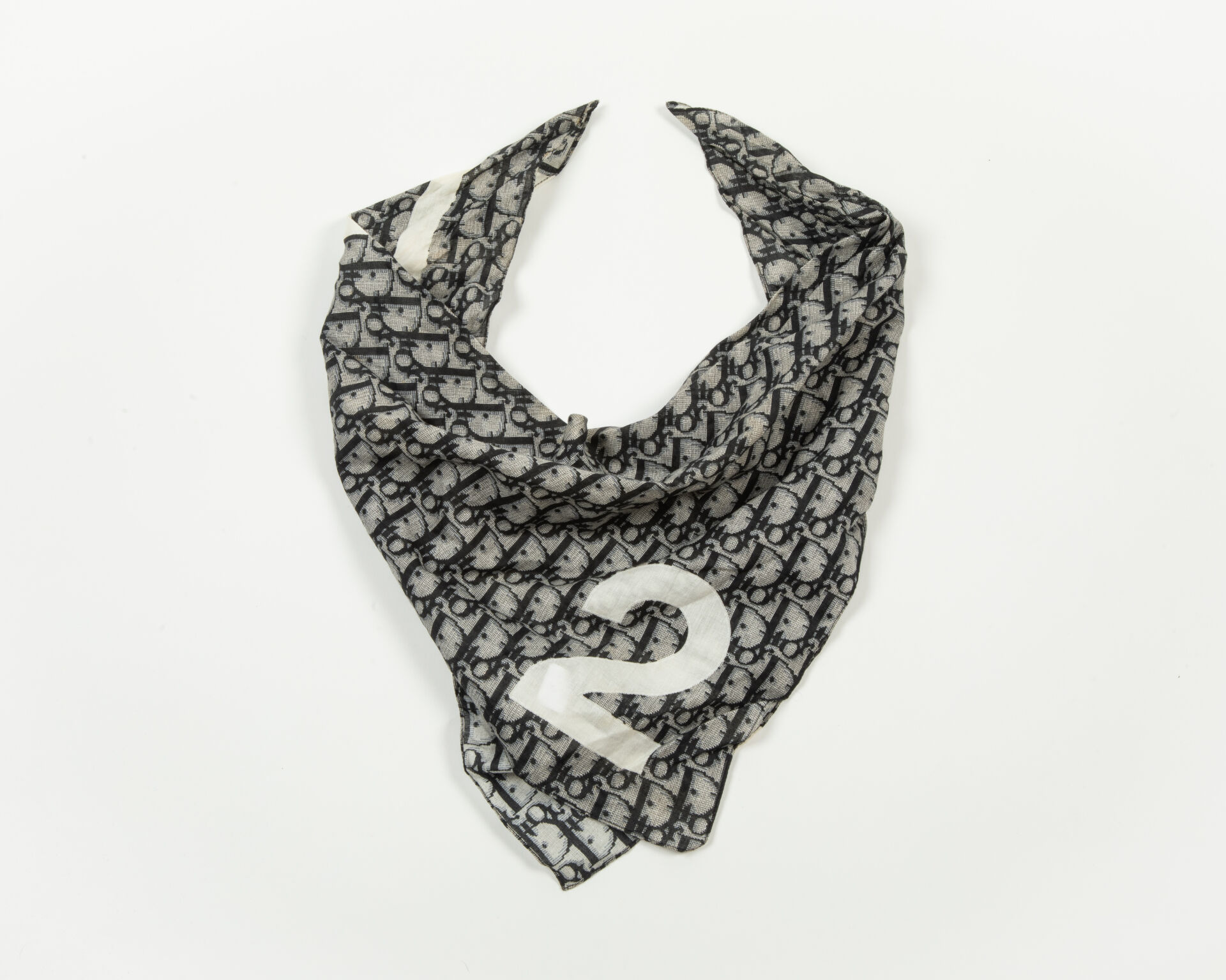 CHRISTIAN DIOR Foulard en coton à décor oblique du monogramme bleu marine de deux bandes blanches et d'un grand chiffre 2 Tâches 49 x 49 cm