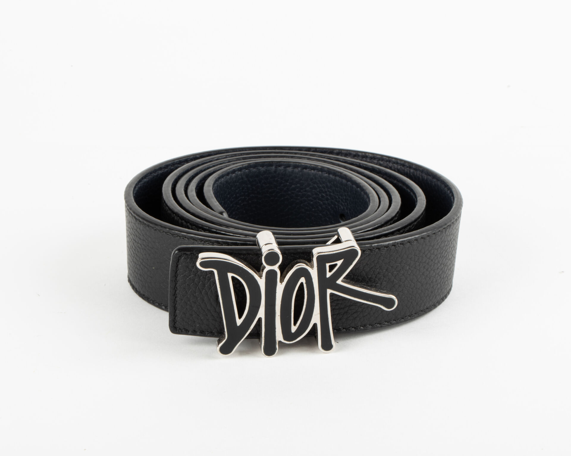 DIOR x Shawn Stussy Ceinture en cuir réversible noir et bleu nuit, boucle en métal palladié et émail Petites griffures Longueur : 130 Dans sa boite