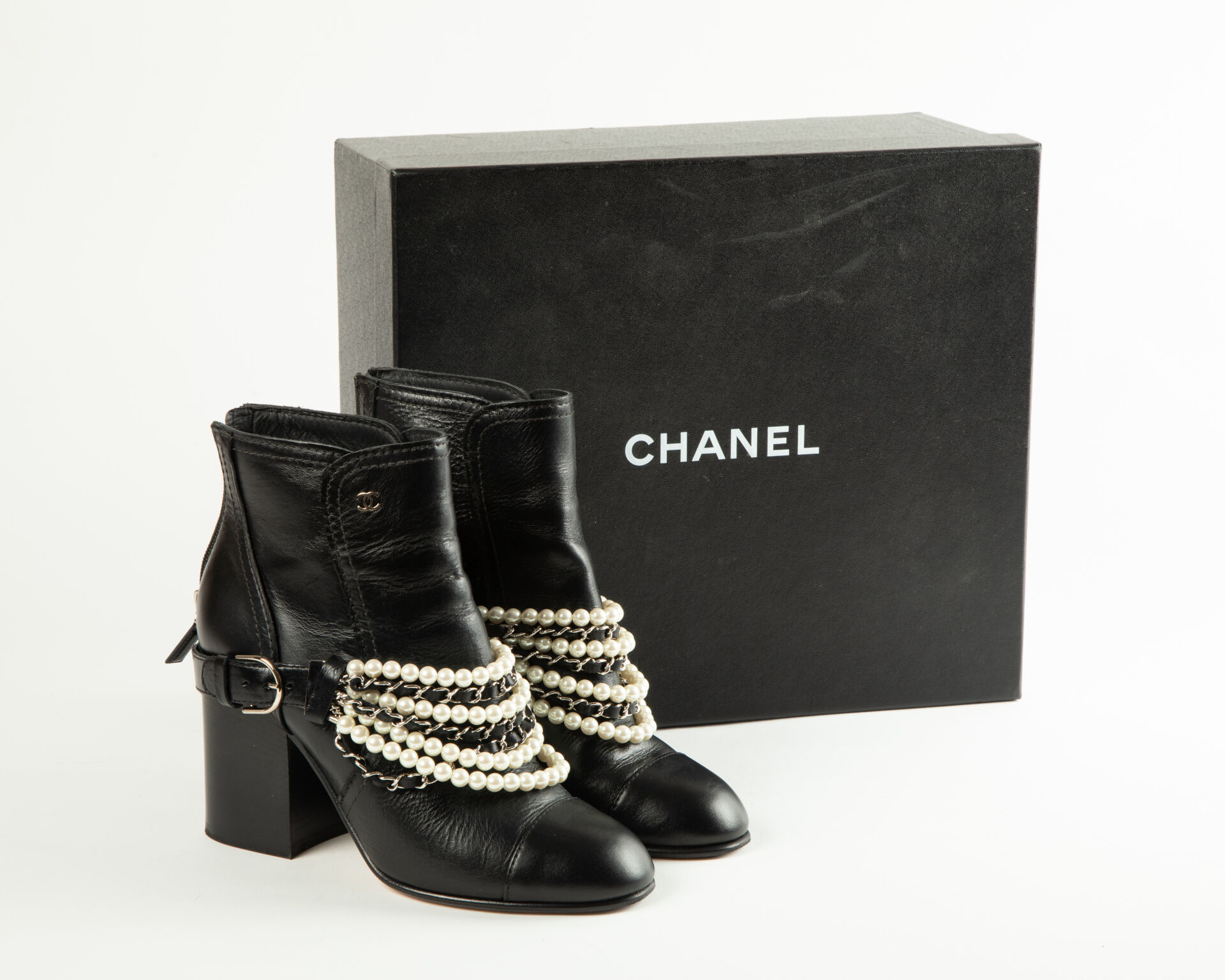 CHANEL, Paris Bottines à talon en cuir noir à décor de rangs de perles et de chaine en chute, ouverture zippée au talon. Taille 38 - Hauteur talon : 9 cm environ Avec dustbag et boite