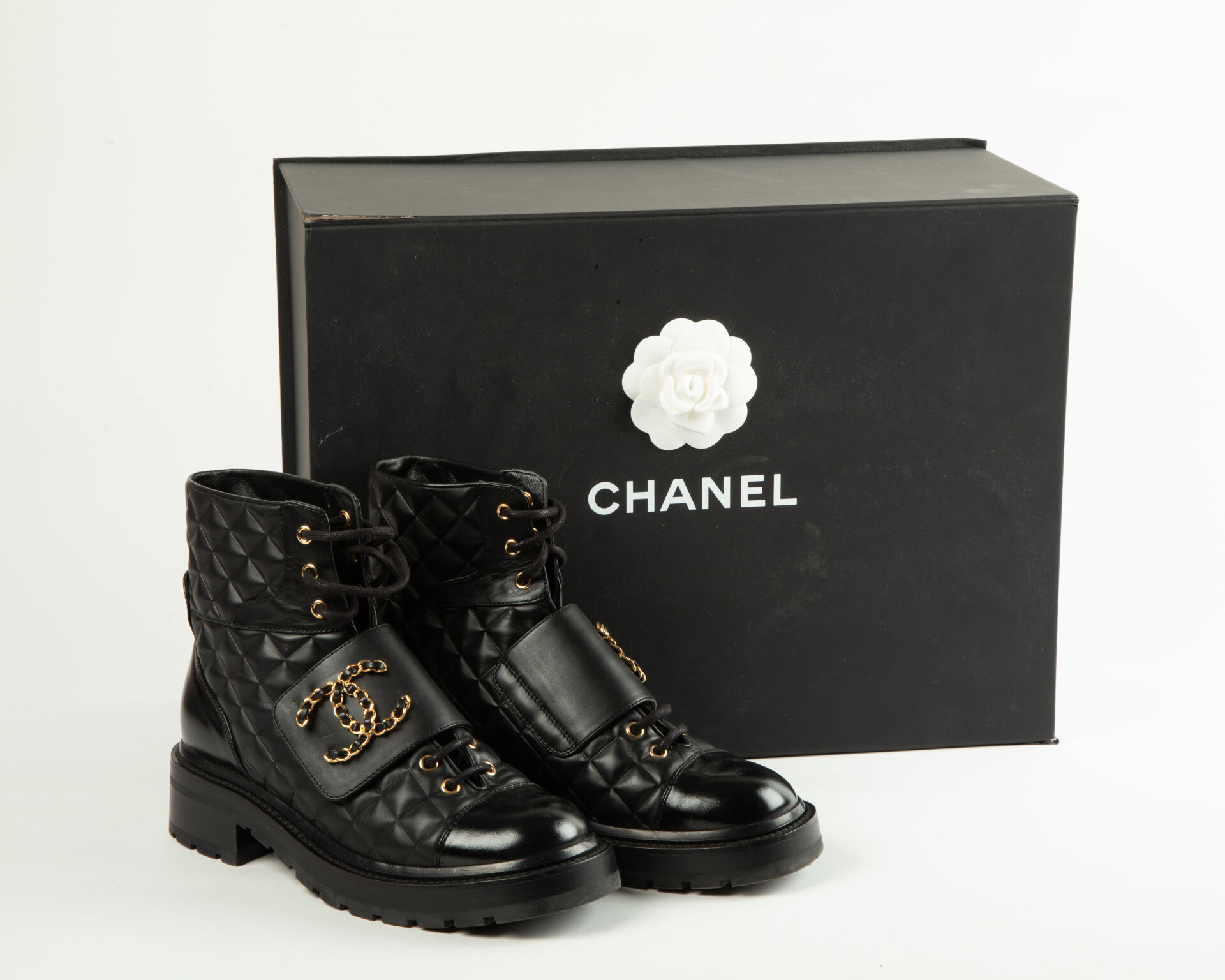 CHANEL, Paris Paire de bottines en cuir matelassé noir à lacets et empiècements en cuir lisse noir, accastillage en métal doré Taille 38 1/2 Rayures Dans leur boite