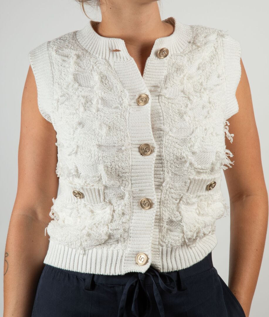 CHANEL, Paris Gilet sans manches à mailles en coton et soie blanc cassé à deux poches plaques, fermant par quatre boutons dorés marqués 5 en strass Taille 40
