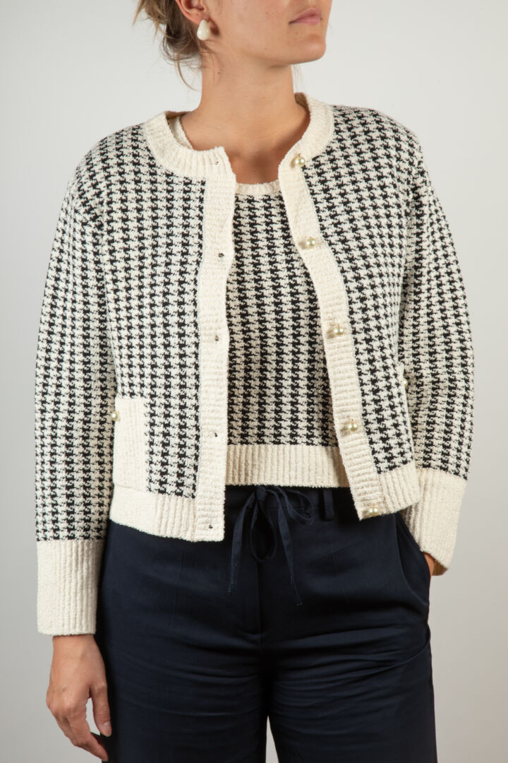 CHRISTIAN DIOR Twin-set en maille de coton technique à motif pied-de-poule noir et blanc comprenant un débardeur et un gilet à deux poches fermant à cinq boutons en perle siglés du logo de la maison. Taille 40