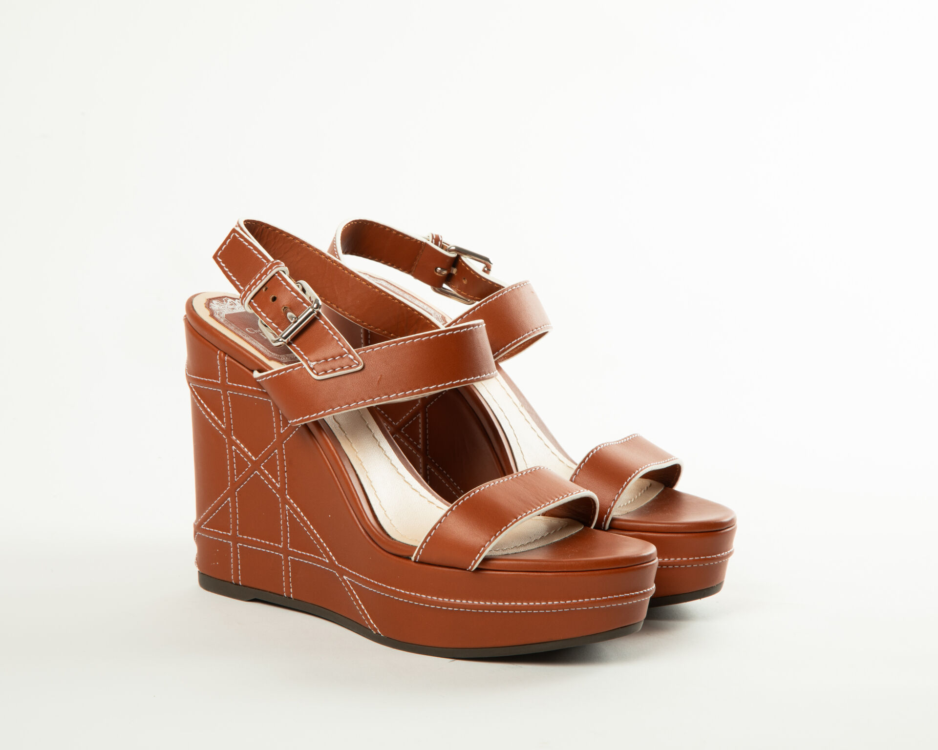 CHRISTIAN DIOR Paire de sandales à talons compensé en cuir camel à surpiqure crème Pointure 38.5 Dans un dustbag
