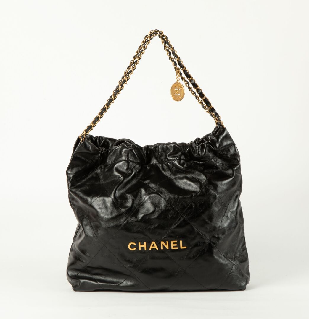 CHANEL, Paris Modèle 22 - Sac à main en cuir matelassé noir à deux anses en chaine dorée et cuir, accastillage en métal doré, intérieur en tissus matelassé à une poche plaquée zippée et une pochette en cuir lisse zippée amovible. H : 34 (hors