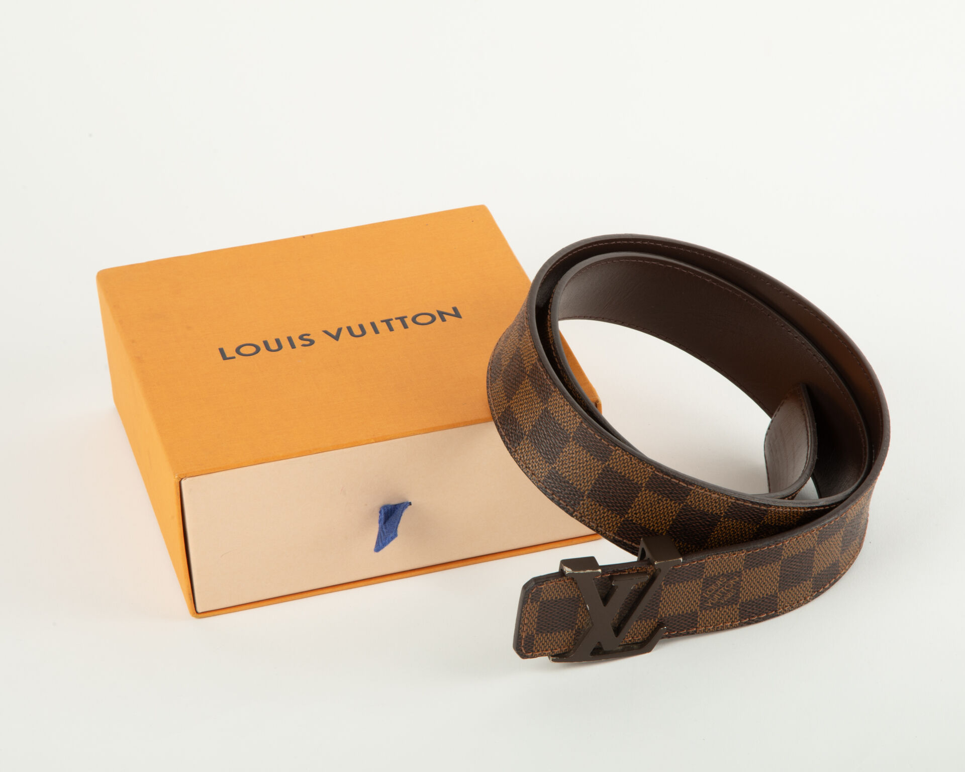 LOUIS VUITTON Ceinture en toile enduite damier ebène et cuir chocolat, boucle au logo de la marque en métal laqué chocolat Traces de frottement et sauts de matière à la boucle Dimensions : 95/18 Dans sa boite